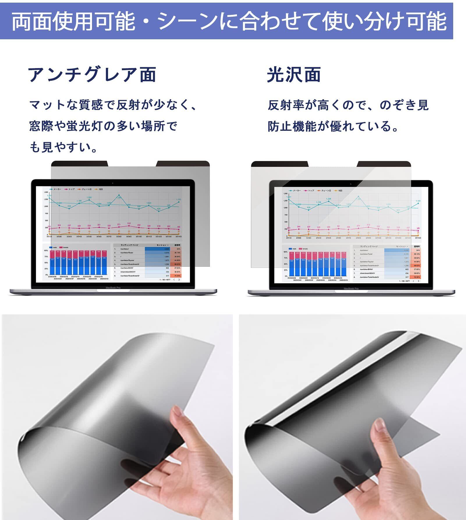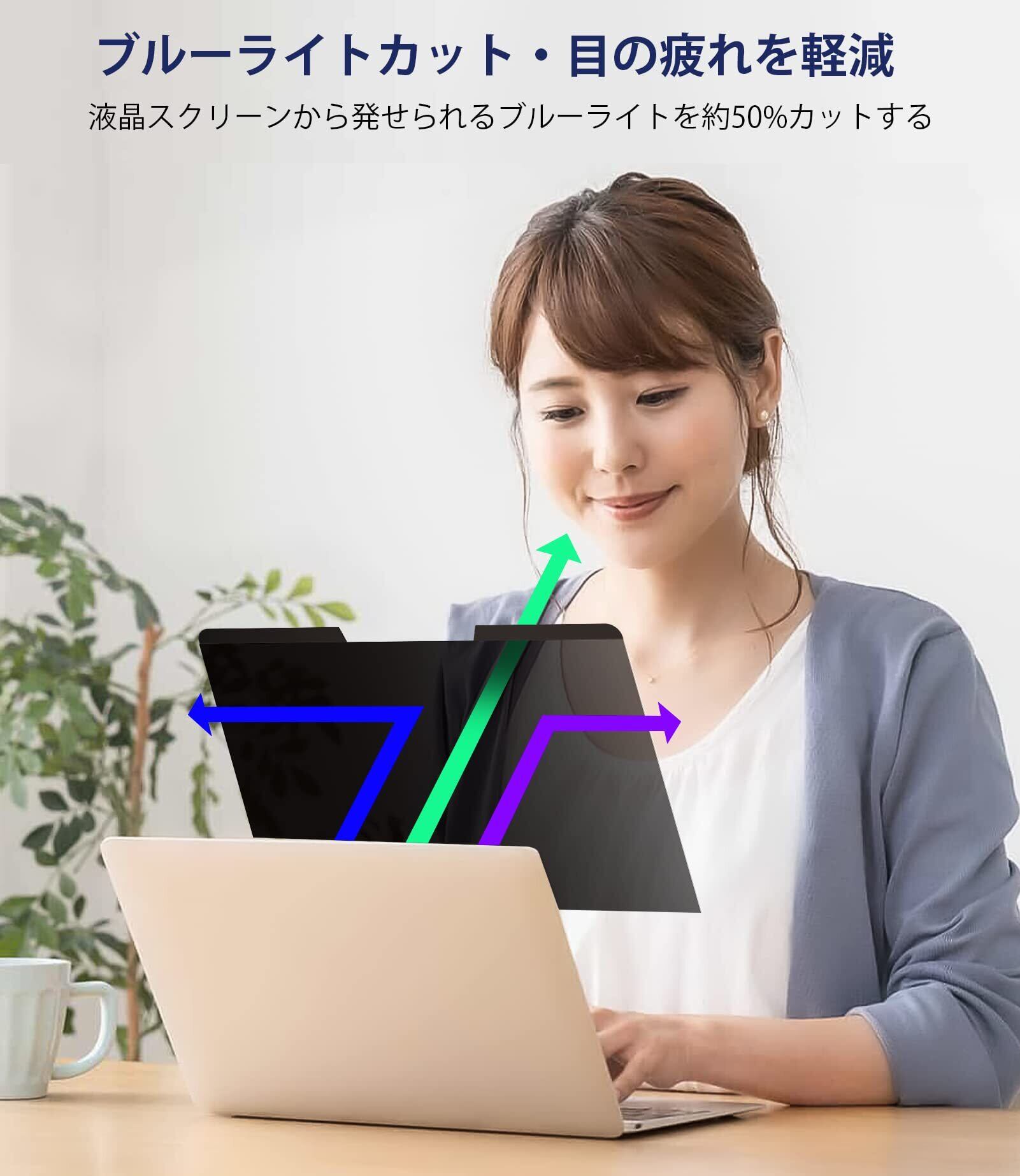 【ブルーライトカット・反射低減】長時間にパソコンのスクリーンから発せられる有害光線を浴びると目の疲れ、ドライアイ、睡眠が乱れるなど体へ影響が益々懸念されています。本プライバシーフィルムは青色光と紫外線カット機能を備えて、ブルーライトを約50%低減し、使用者のプライバシーを守るだけではなく、目も守りますので、体や視力を考えるなら、ブルーライト対応のプライバシーフィルムがおススメします。