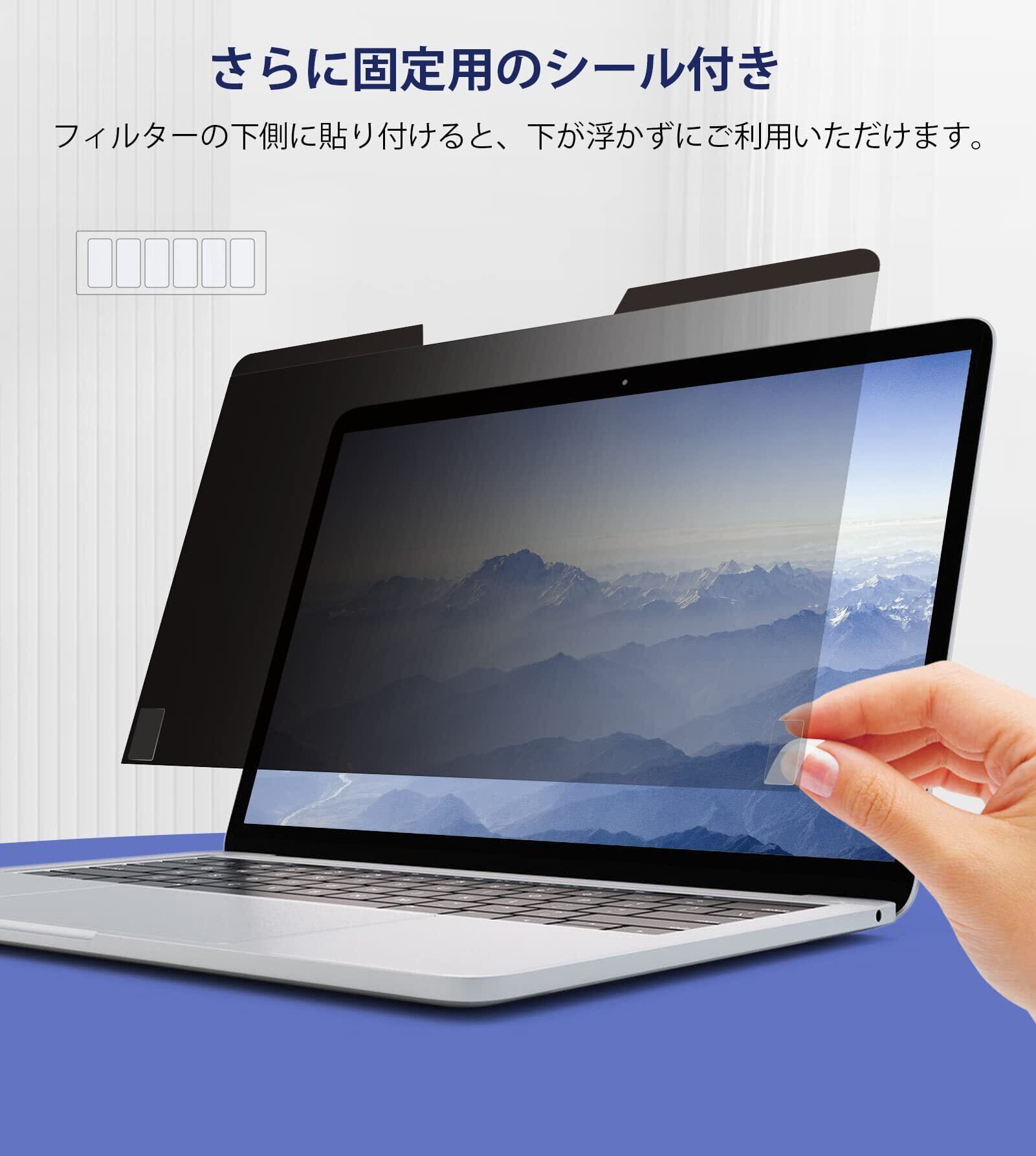 【マグネットタイプ・着脱式】ワンアクションで簡単に着脱できるので、必要なときだけ取付、使用シーンを選びません。プライベートルームではフィルターを外し、外出先や他人との共有スペースではプライバシーフィルターをつけて、お客様の習慣や好みに合わせて安心・安全にお使いいただけます。