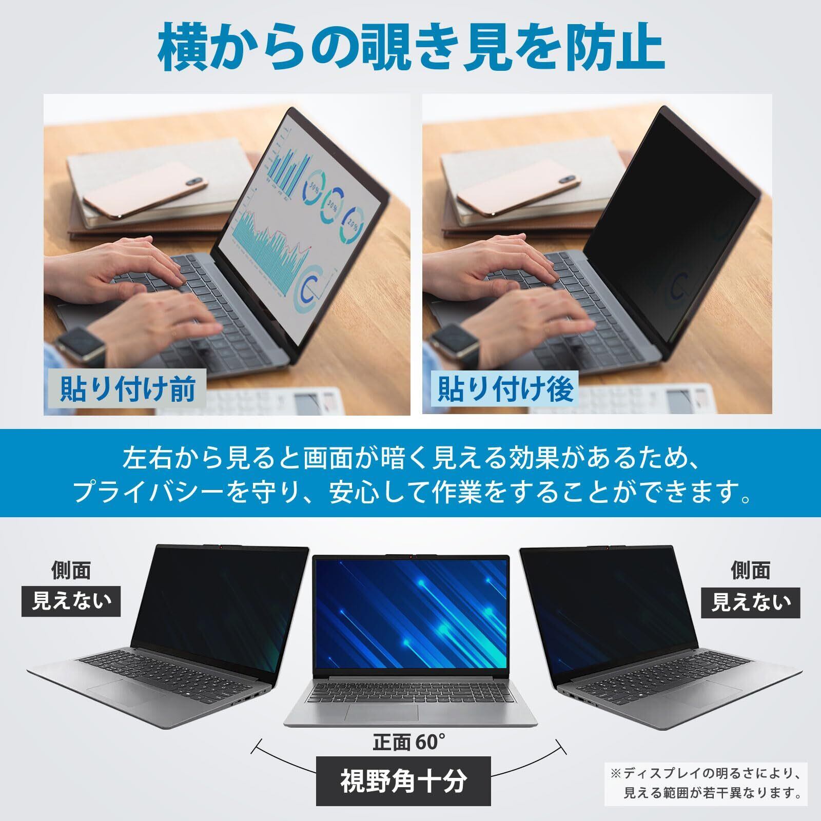 プライバシー保護:正面からの視認性を保ちつつ、側面からの覗き見を防ぐことができます。約60度の視野角(左右30度)を越えると、画面が暗く表示されるため、新幹線やカフェで作業をしていても情報の漏洩リスクを回避することができます。 フィルターの寸法:14インチ 16:9 フィルターの寸法:309mm x 174mm