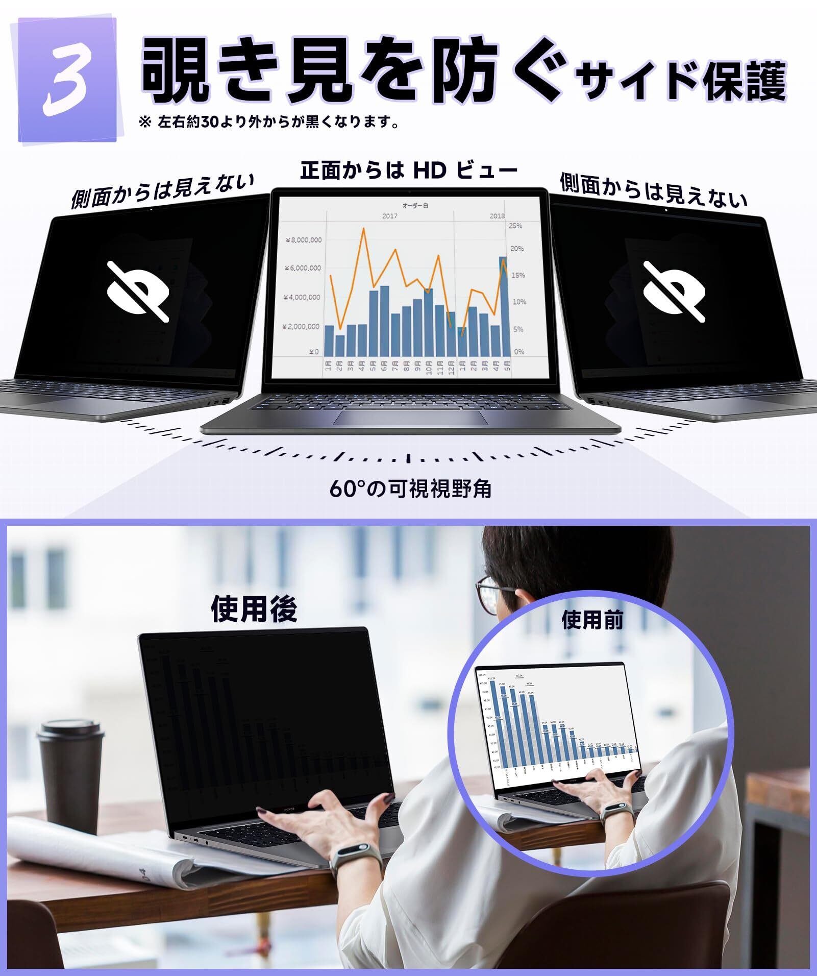 【目の保護】パソコンのぞき見防止保護フィルムは日本から輸入された高品質の素材と独自の技術を使用しており、紫外線を最大92%、ブルーライトを95%カットします。画面上のデータを保護するだけでなく、目の疲れも防ぐスクリーンプロテクターです。眼圧を下げ、目の筋肉をリラックスさせるのに役立ちます