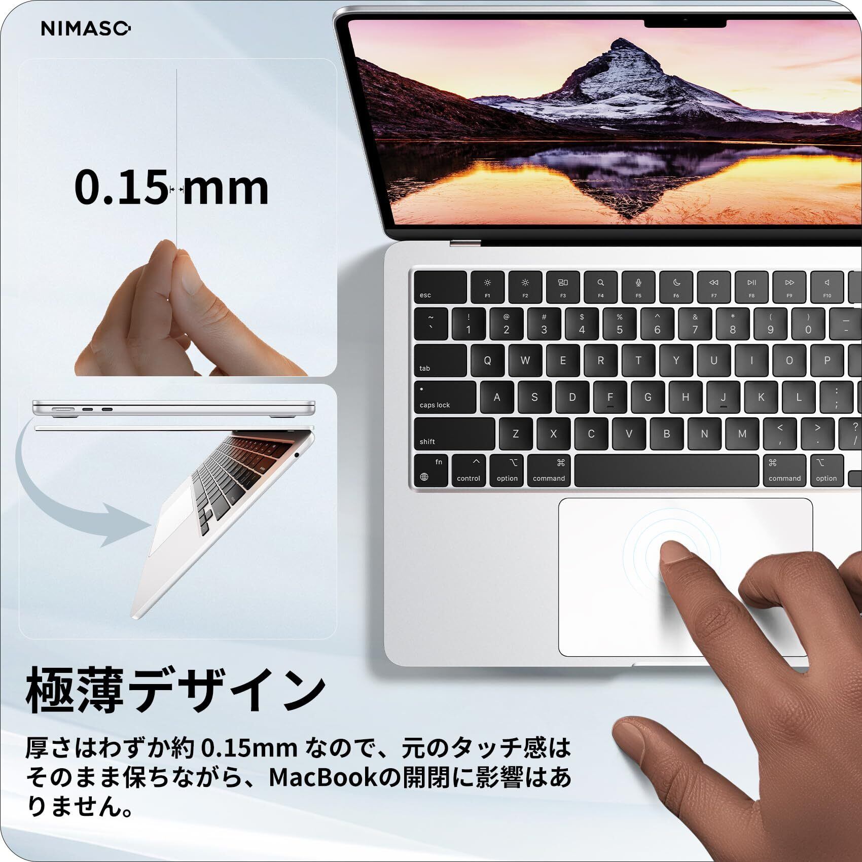 極薄デザイン:高透過率を持つ極薄素材製、フィルムの装着感はゼロで、マックブックエアーの開閉に影響はありません。
