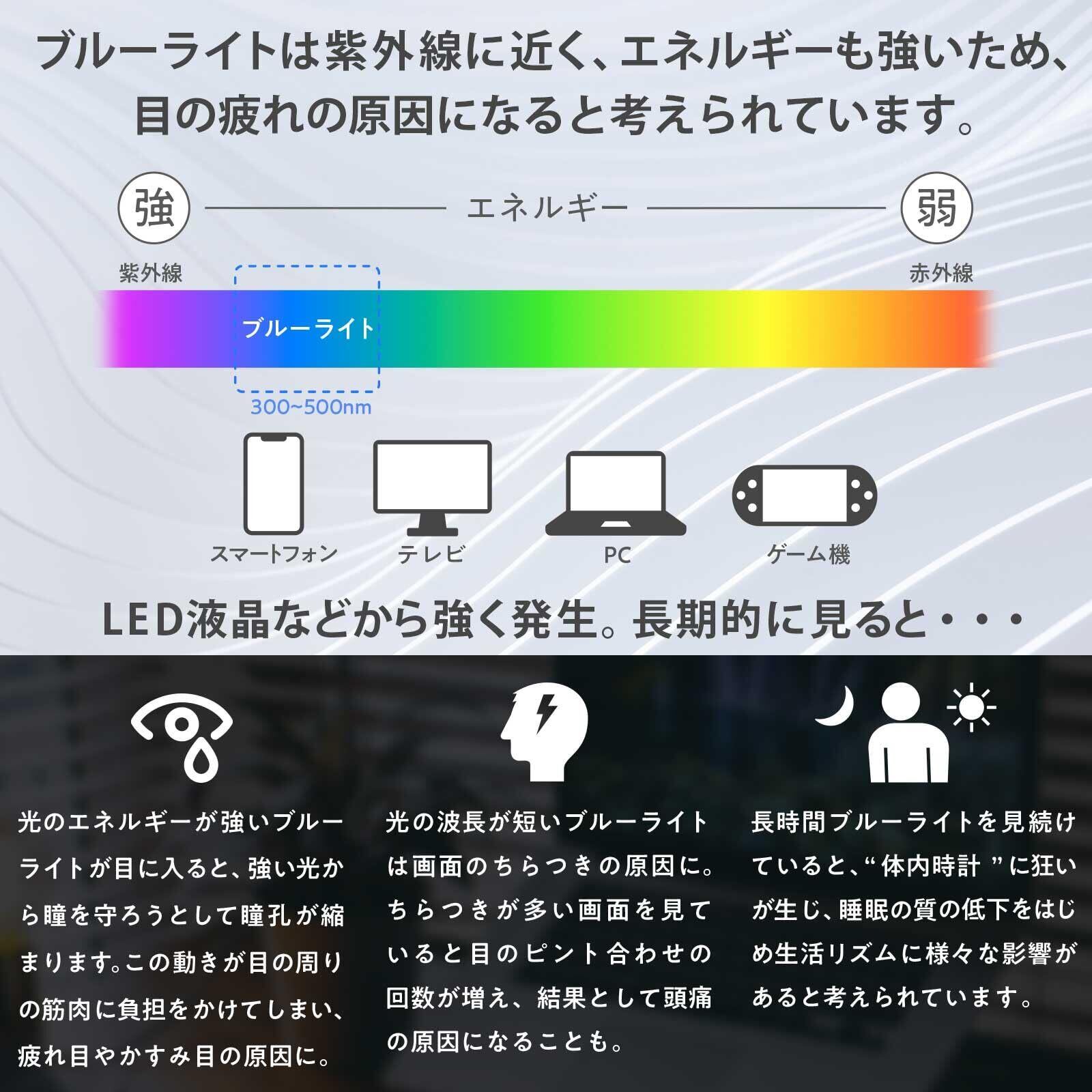 ブルーライトカット率:49% 紫外線カット率:99%。目の負担を軽減するため、長時間の作業に最適です。