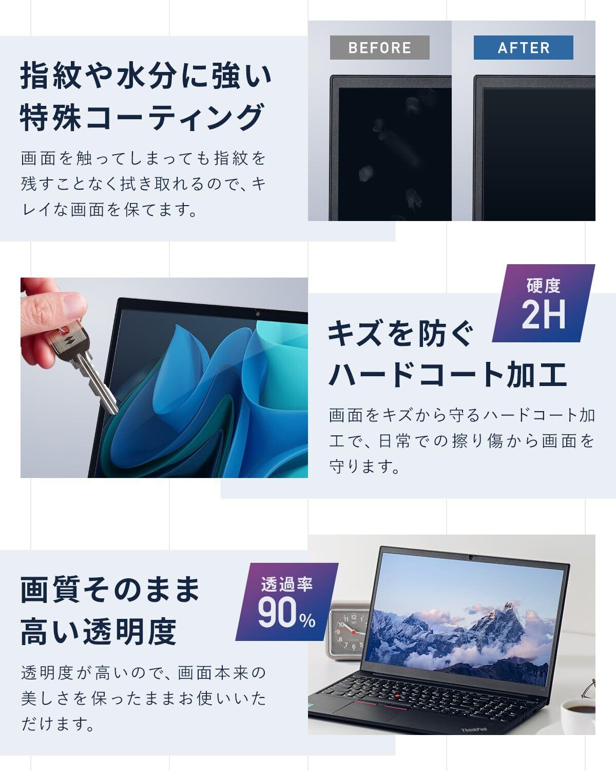 画質そのまま高い透明度:透明度が高いので、画面本来の美しさを保ったままお使いいただけます。