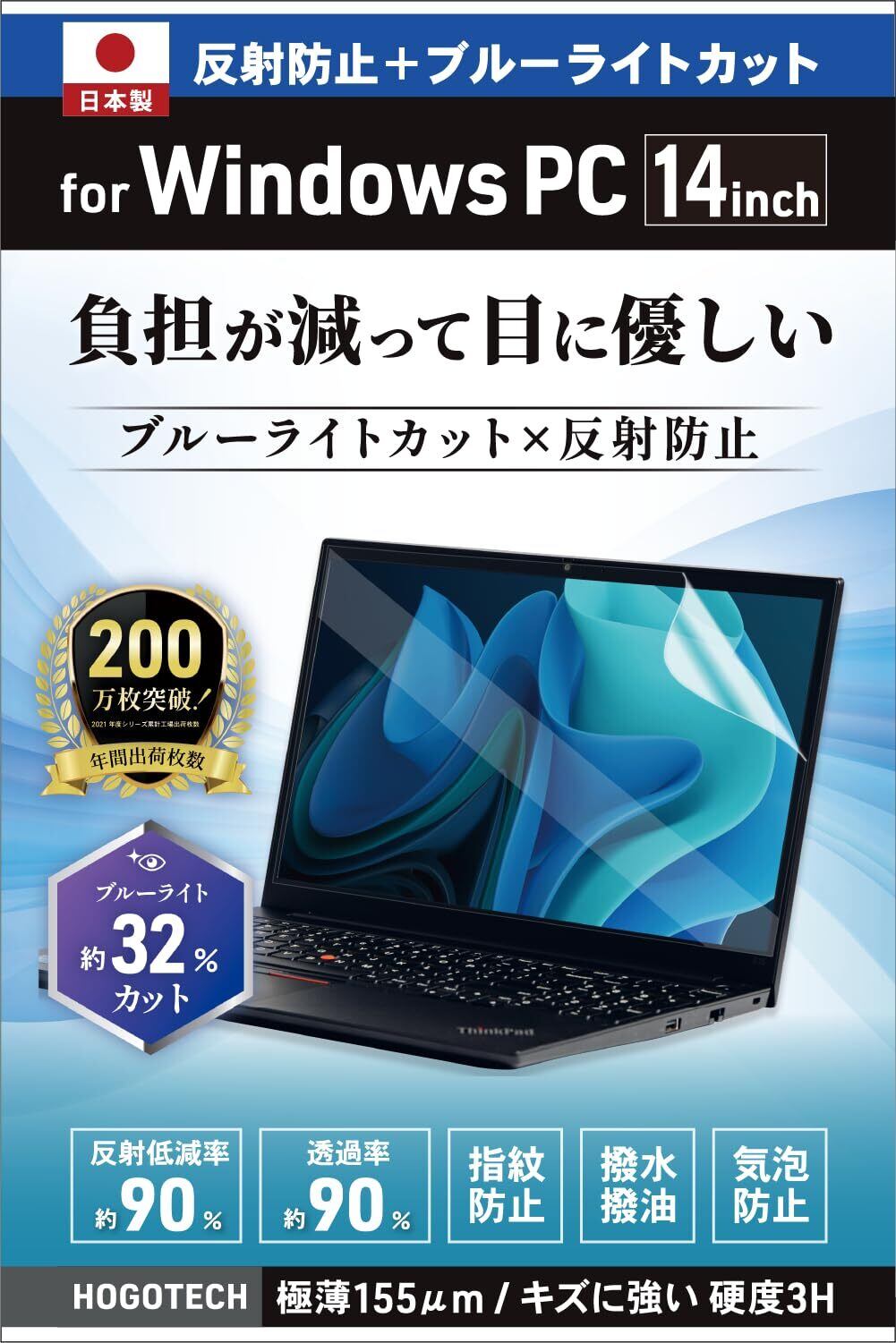 【日本製】ブルーライトカット アンチグレア Windows14インチ 保護フィルム 縦 174mm × 横 309mm 反射防止 気泡防止 HOGOTECH
