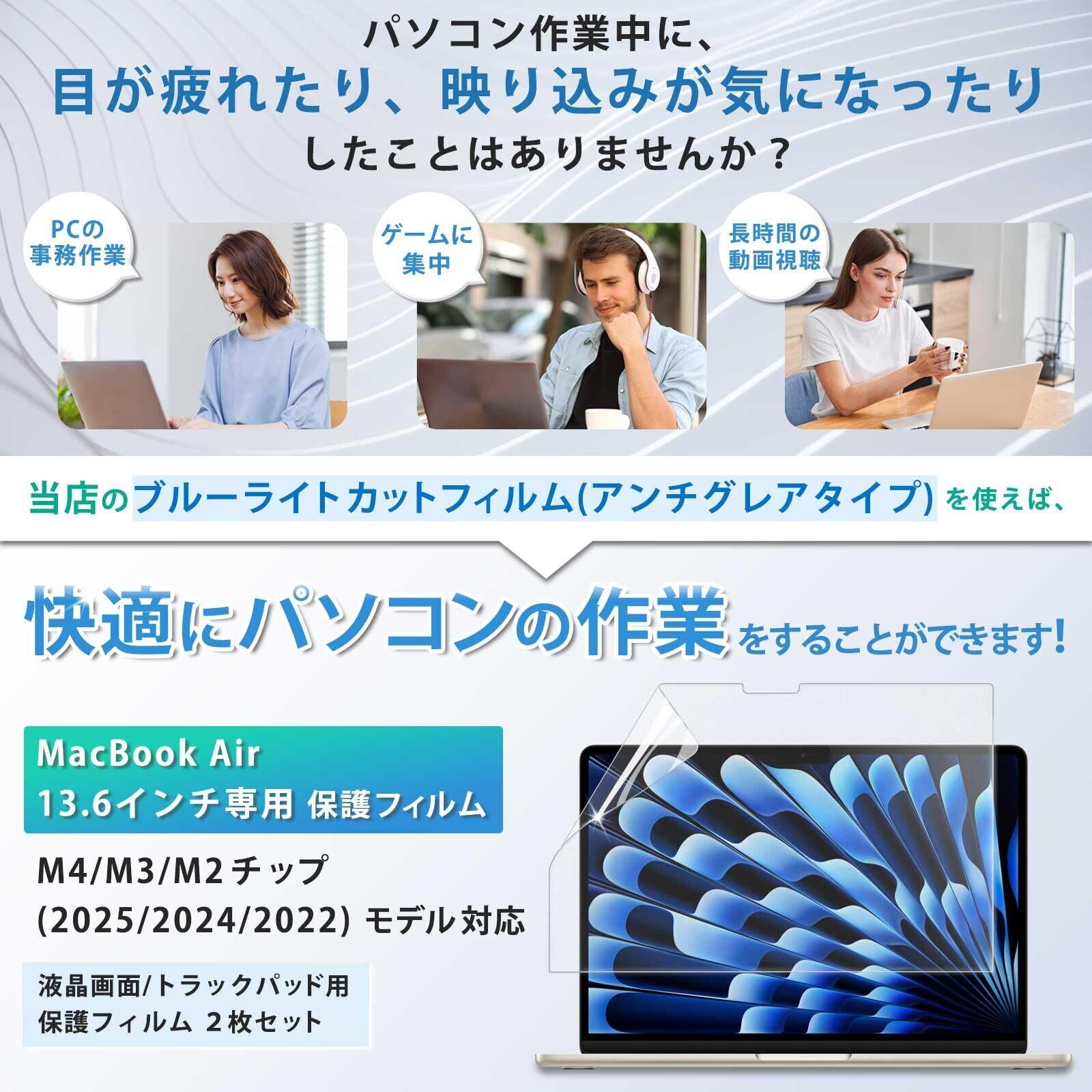 Lifeinnotech アンチグレア MacBook Air 13.6インチ 2025 M4 /M3/M2チップ 用 フィルム ブルーライトカット 保護フィルム マックブックエアー 13インチ 2024 2022 反射低減 指紋防止 抗菌 (2点セット)