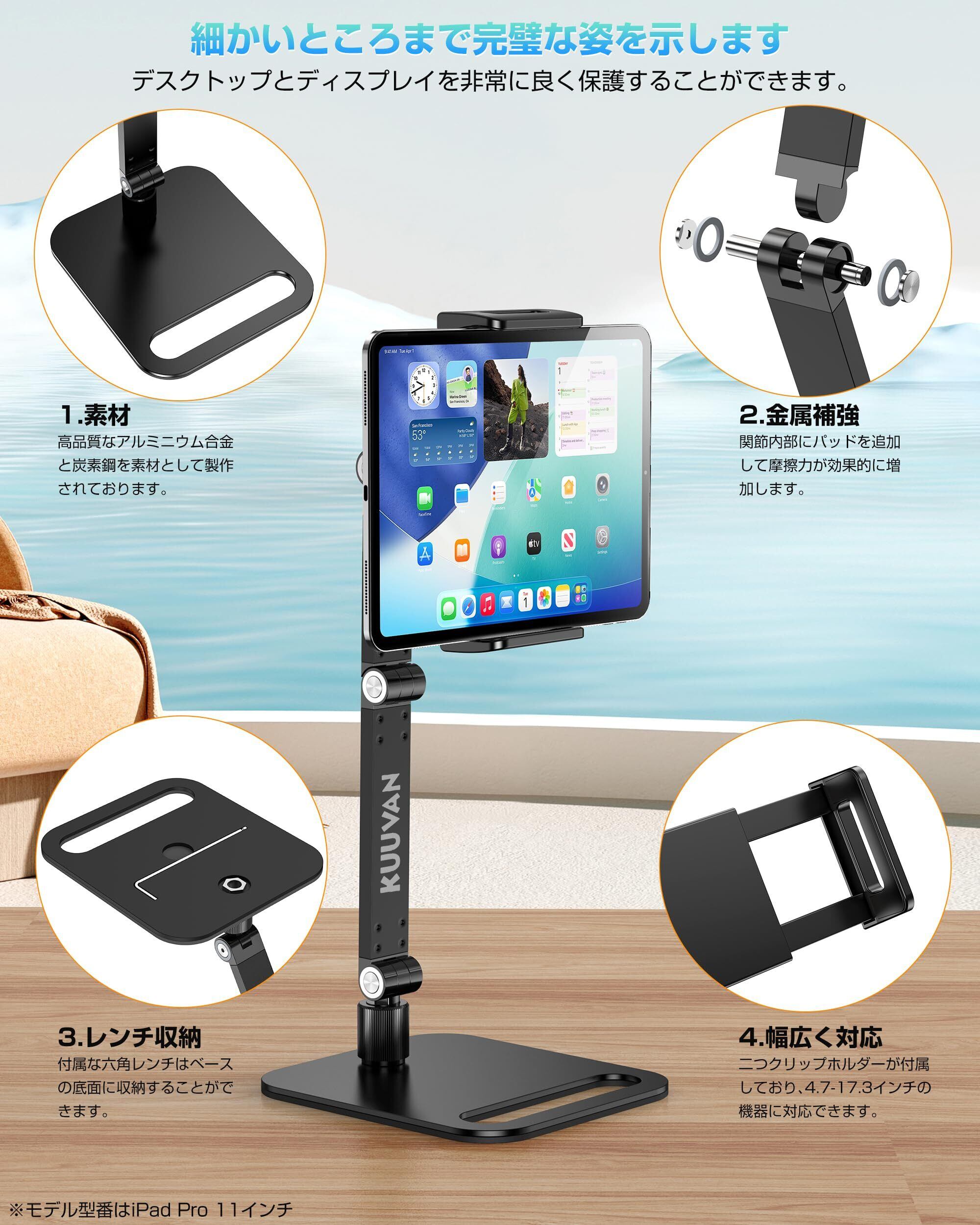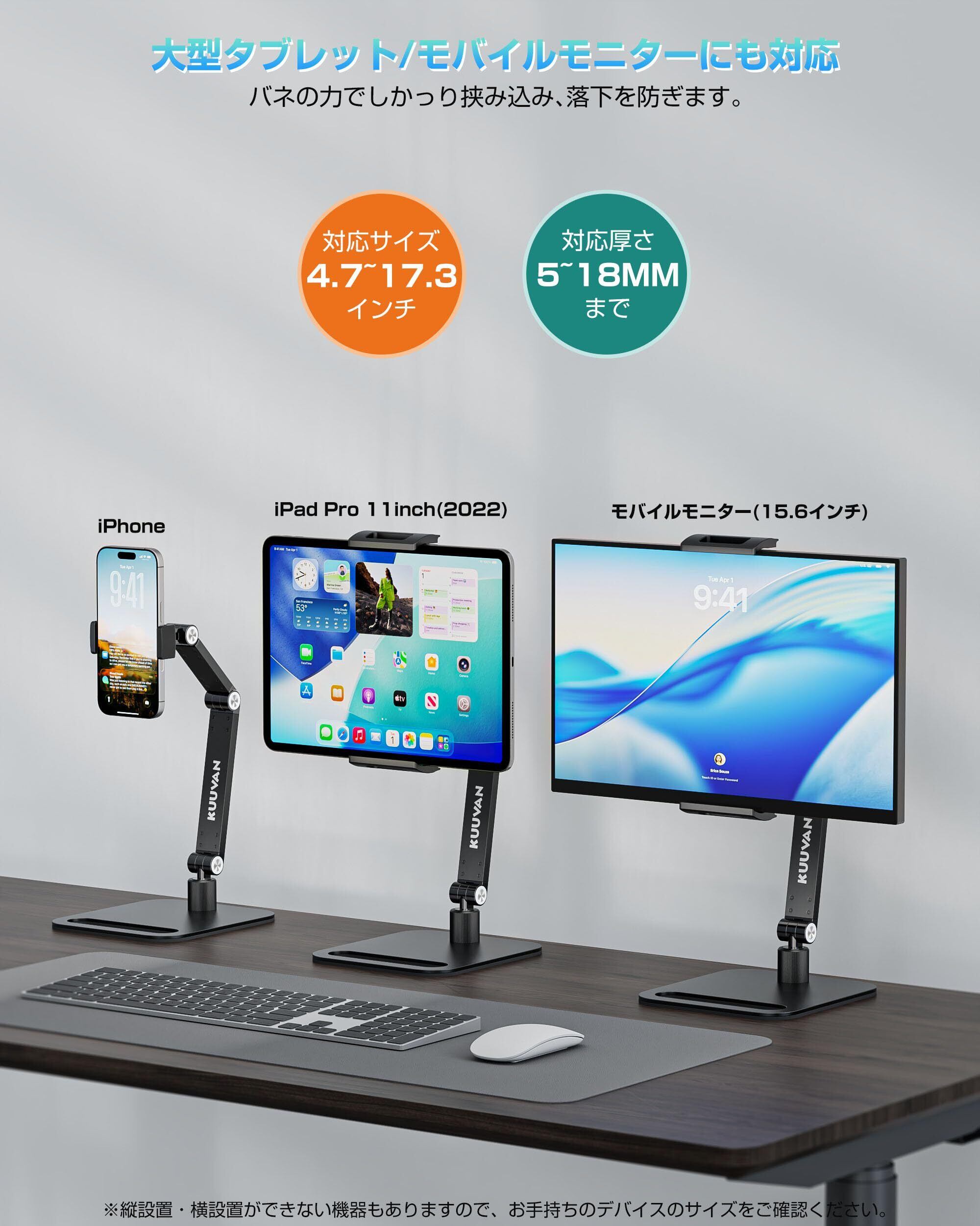 KUUVAN タブレット スタンド 卓上 iPad アーム アルミ製 4.7-17.3インチ対応 耐荷重1.5キロ 金属ジョイント スマホ俯瞰撮影 角度無段階 スマホ/タブレット/15.6型,17.3型モバイルモニタ対応 ブラック