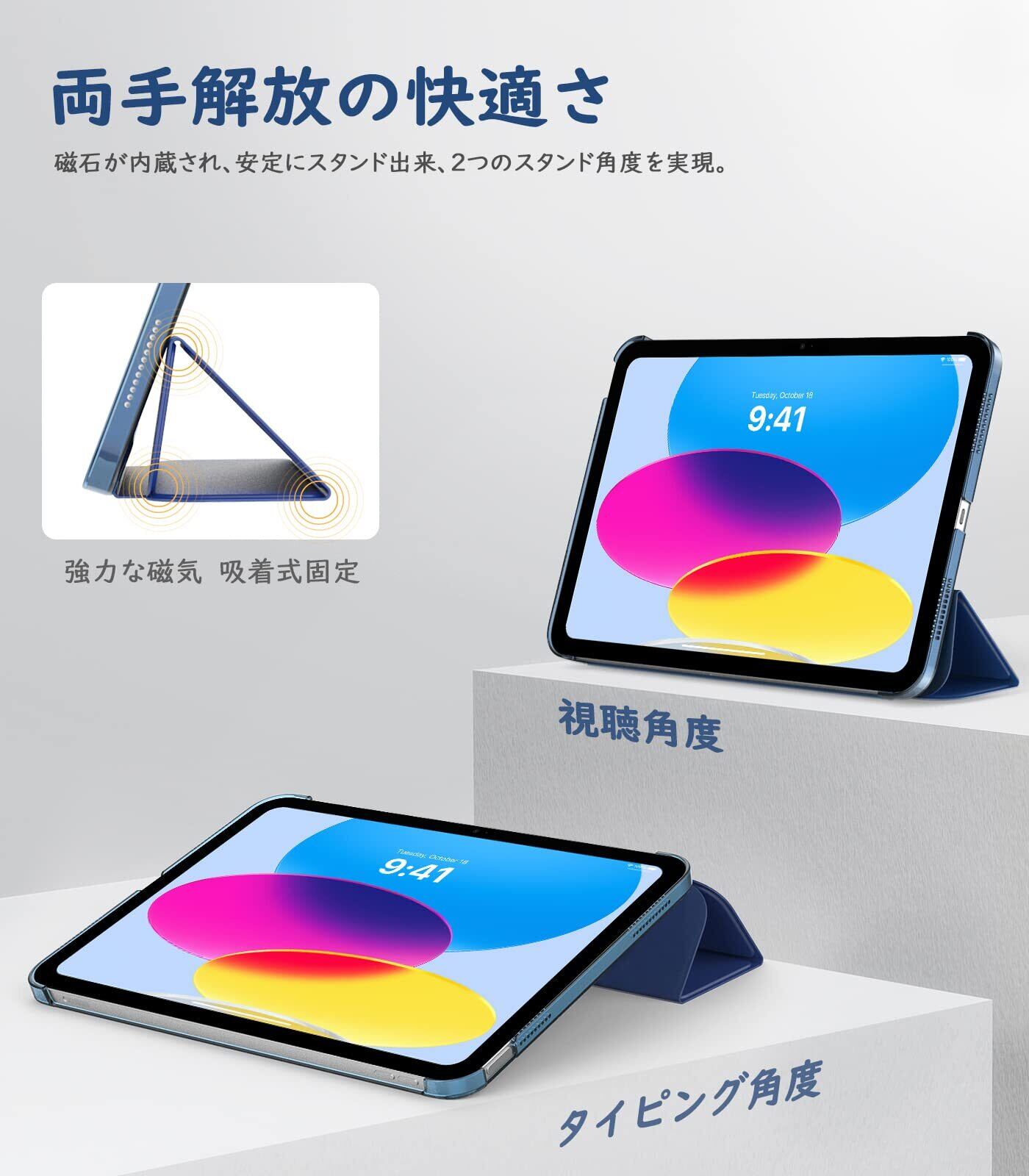 「三つ折りスタンド設計」 三つ折りのフロントカバーには、複数のマグネットが均等に内蔵されています。iPadを立てて使用する際にしっかりサポートし、安定した角度を維持したまま快適にお使いいただけます。
