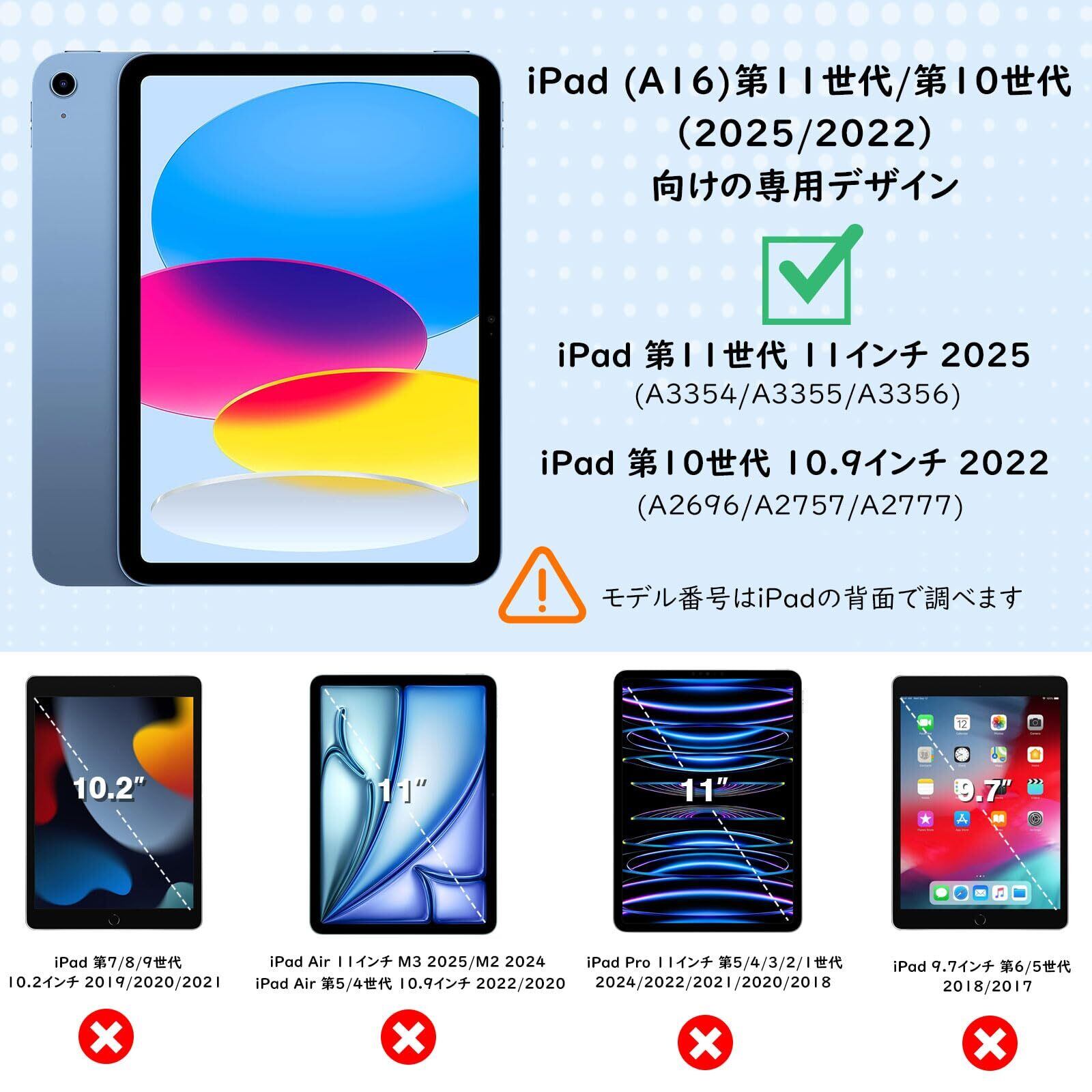 「対応機種」 2025年新発売のNew iPad(A16) 11インチ 第11世代(モデル番号:A3354/A3355/A3356)及び2022年発売のiPad 10.9インチ 第10世代(モデル番号:A2696/A2757/A2777)にカスタム設計しており、iPad Air 11 第7/6世代(×)、iPad Air 10.9 第5/4世代(×)、又は他のモデルには適用しません。購入する前にタブレットの機種/モデル番号を確認してください。