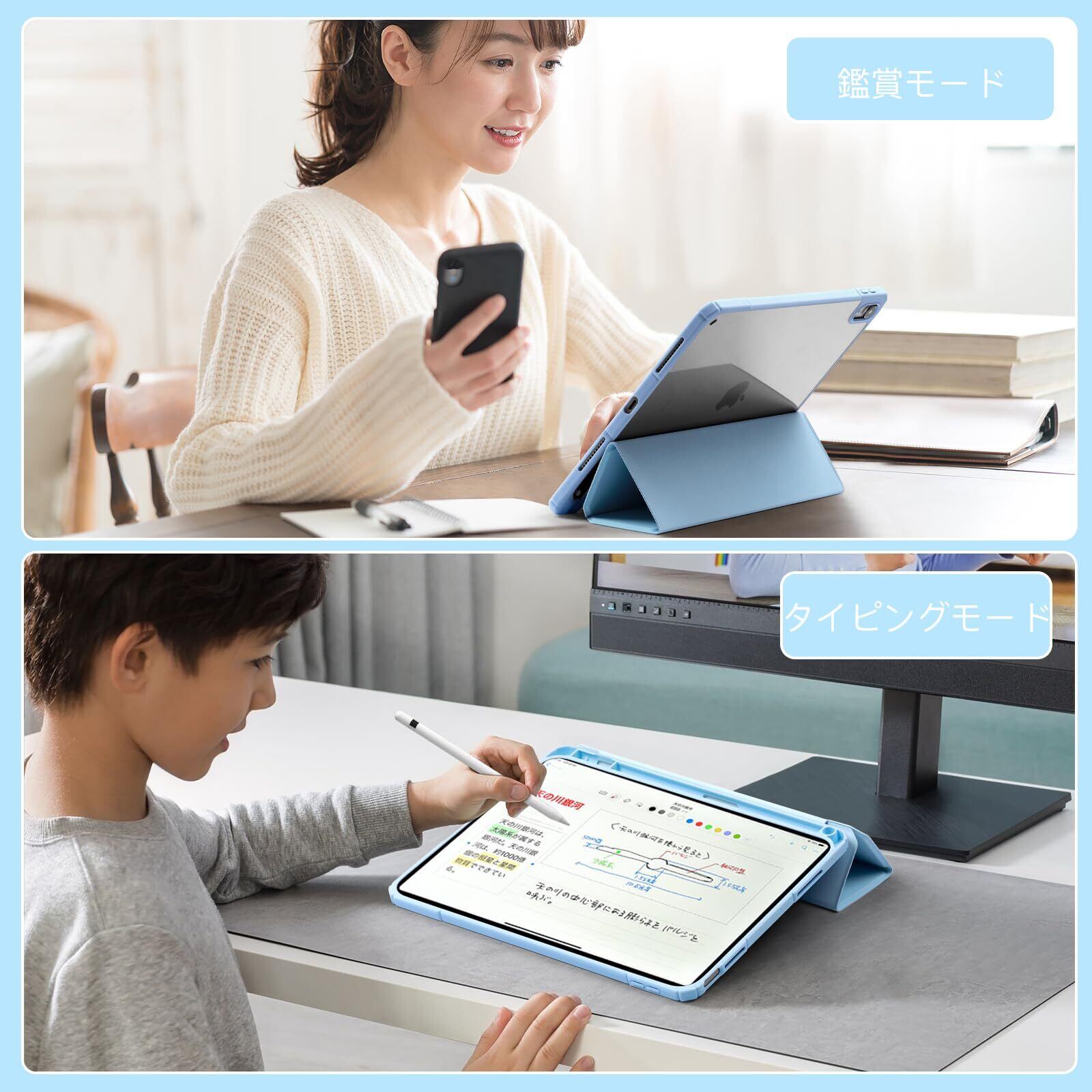 【三つ折り・スタンド機能】カバーは折りたたみ仕様でデザインされており、折りたたんでスタンドになり、二つの角度に調整可能です。これにより、動画視聴やタイピング、ゲームなどを快適にお楽しみいただけます。