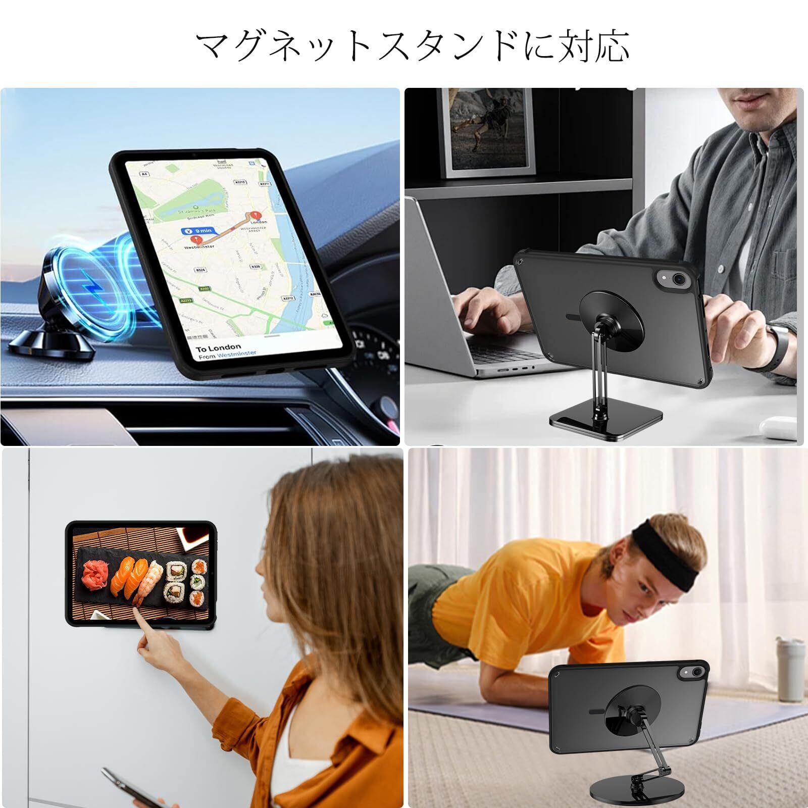 【より強い磁気吸引力】このiPad mini 7 ケースには、工業グレードのN52高強度磁石が搭載されており、さまざまなサポート位置を実現できます。車の磁気マウント、MagSafeスタンド、車両ナビゲーション/デスクトップマウント/金属表面サスペンションと完全に互換性があり、手を自由にして便利な生活を楽しめます。