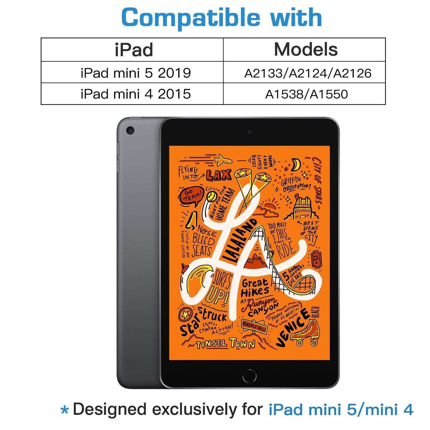New iPad mini 5 (A2133/A2024/A2126) 2019年モデル7.9インチのタブレットに対応する専用保護ケース、2015年モデルのiPad mini 4(A1538/A1550)にも適用です。その他のiPadモデルと互換性がありませんので、ご購入する時はお使いのiPadの裏面にあるモデル番号を確認してください。