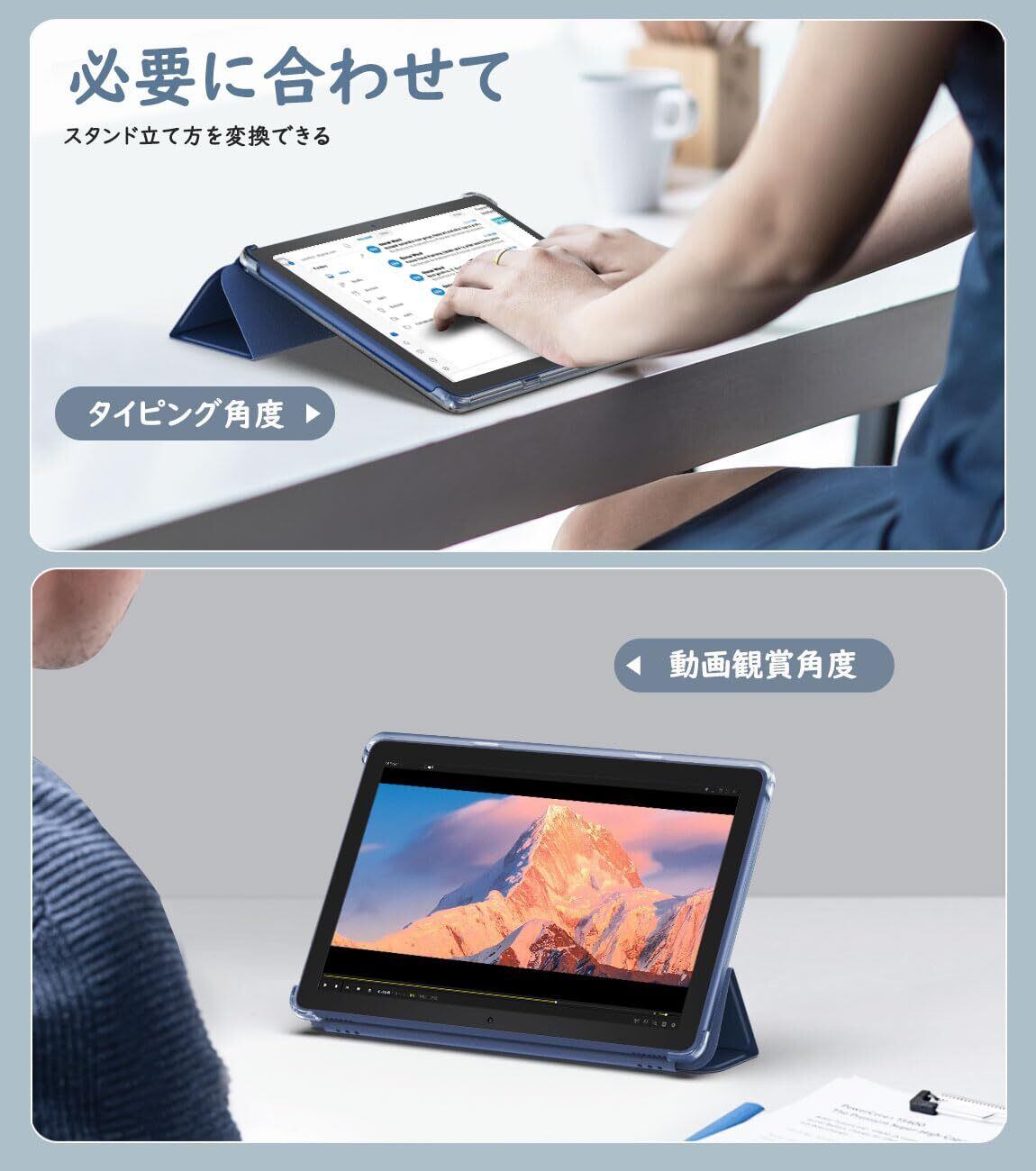 「便利なスタンド仕様」 フラップ部分には折り目が2ヶ所設けられており、折り曲がると手軽にスタンドに立てかける仕様より、タイピングや動画視聴などの2つの角度をご必要に応じてに使い分けられて、両手解放で動画鑑賞を楽々に楽しめ、仕事やゲームなどにもより快適に進められます。