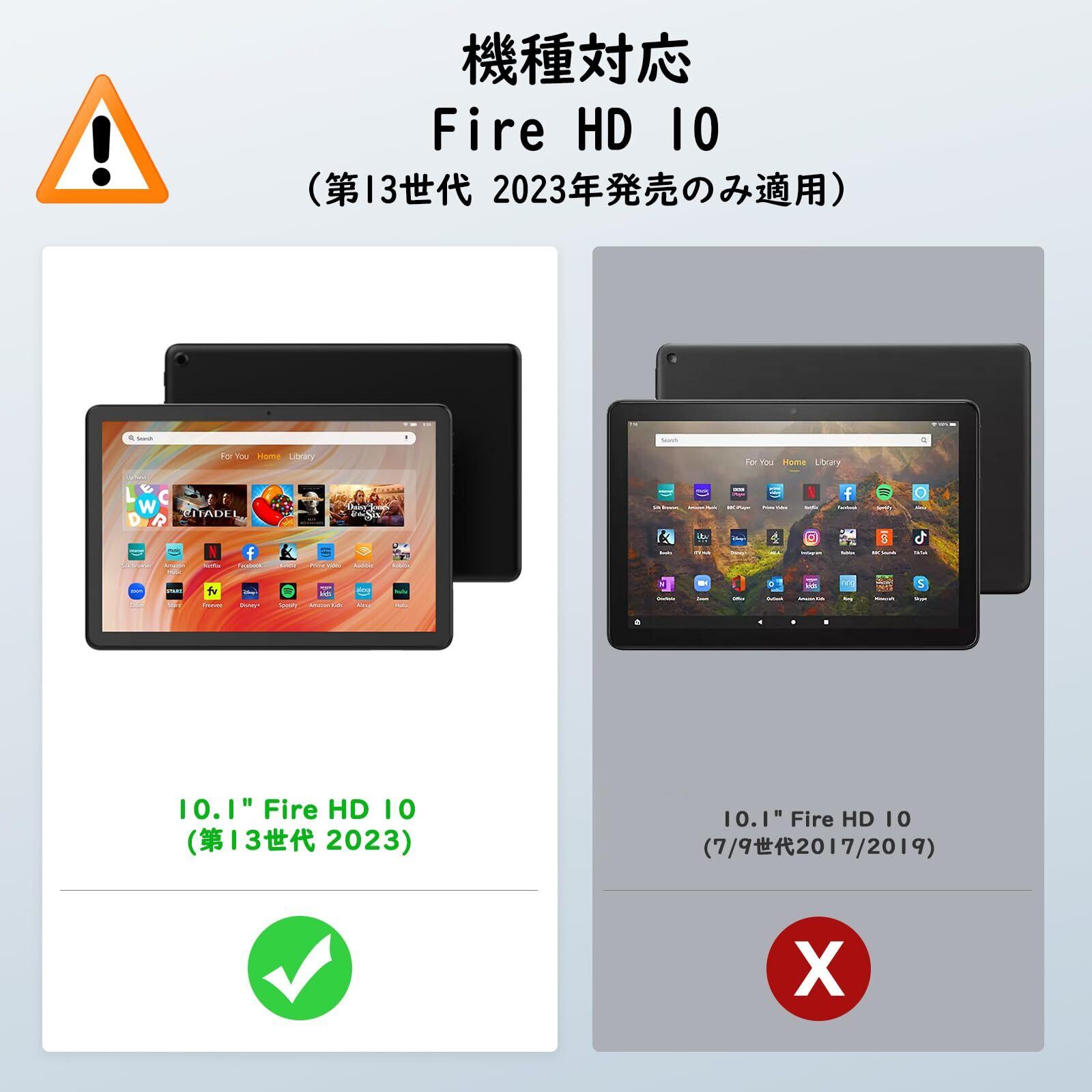 「適用機種」 2023年発売のFire HD 10 第13世代新型のみに対応できる手帳式のケースです。薄型かつ軽量化にした設計で、取り扱いやすくFireにピッタリフィットできる見栄えも保護力も両立させたスマートケースです。ご注意:第13世代以外の機種に対応できません。ご購入になる前に、機種をしっかりと確認してください。