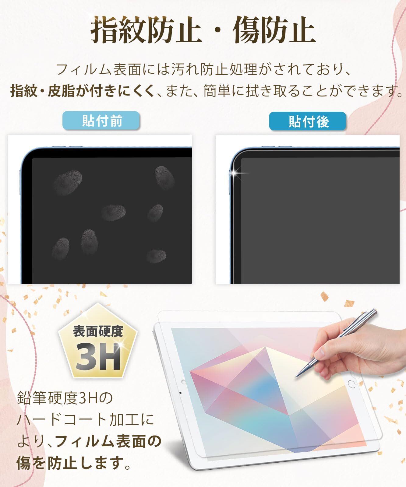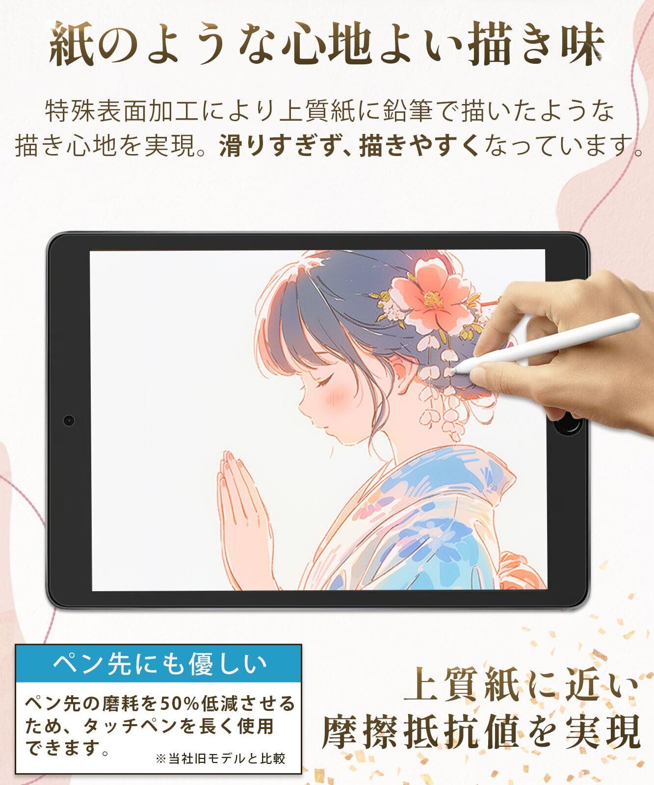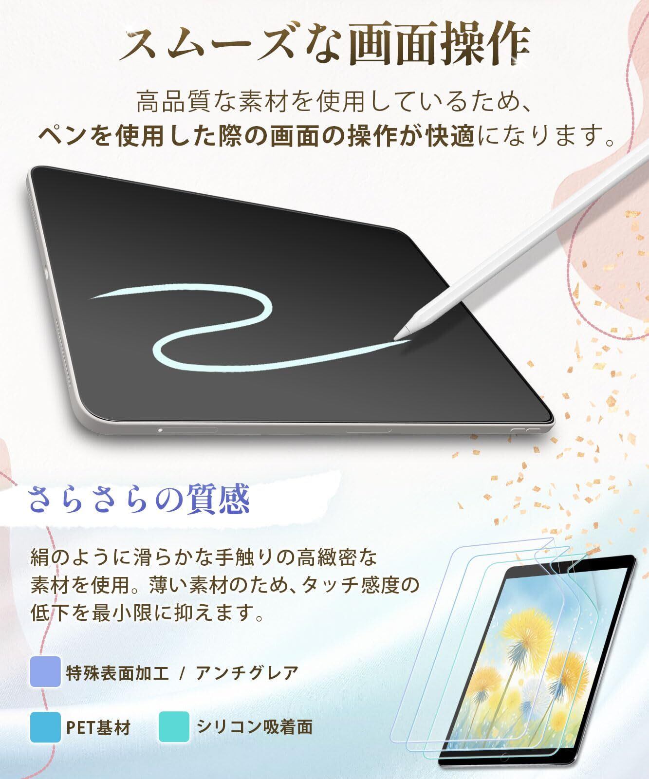 【紙のような描き心地】特殊表面加工により上質紙に鉛筆で描いたような描き心地を実現。 iPadで手書き作業をする人(ノート作成やイラスト)におすすめのペーパーライクフィルムです。️安い商品より圧倒的に書きやすい! さらさらした手触りで、書き味にこだわりたい方に最適です。また、表面を保護し、傷や汚れも防ぐ液晶保護フィルム(画面保護シート)です。