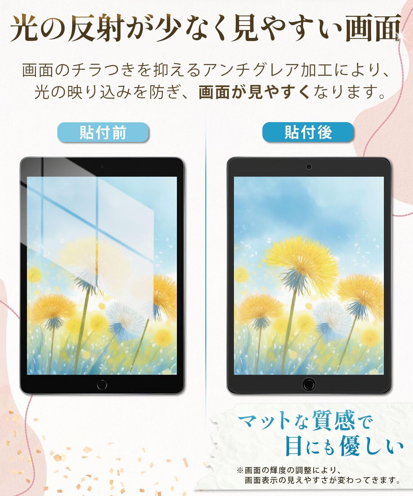 【貼り付け簡単】自己吸着タイプなので接着剤や両面テープを使わずにアイパッドの液晶画面への貼り付けが可能。フィルムを貼った後、気泡が残っても、時間の経過とともに分散するため、数日経てば、気泡は目立たなく消えたようになります。※気泡サイズにより消えない場合もございます。