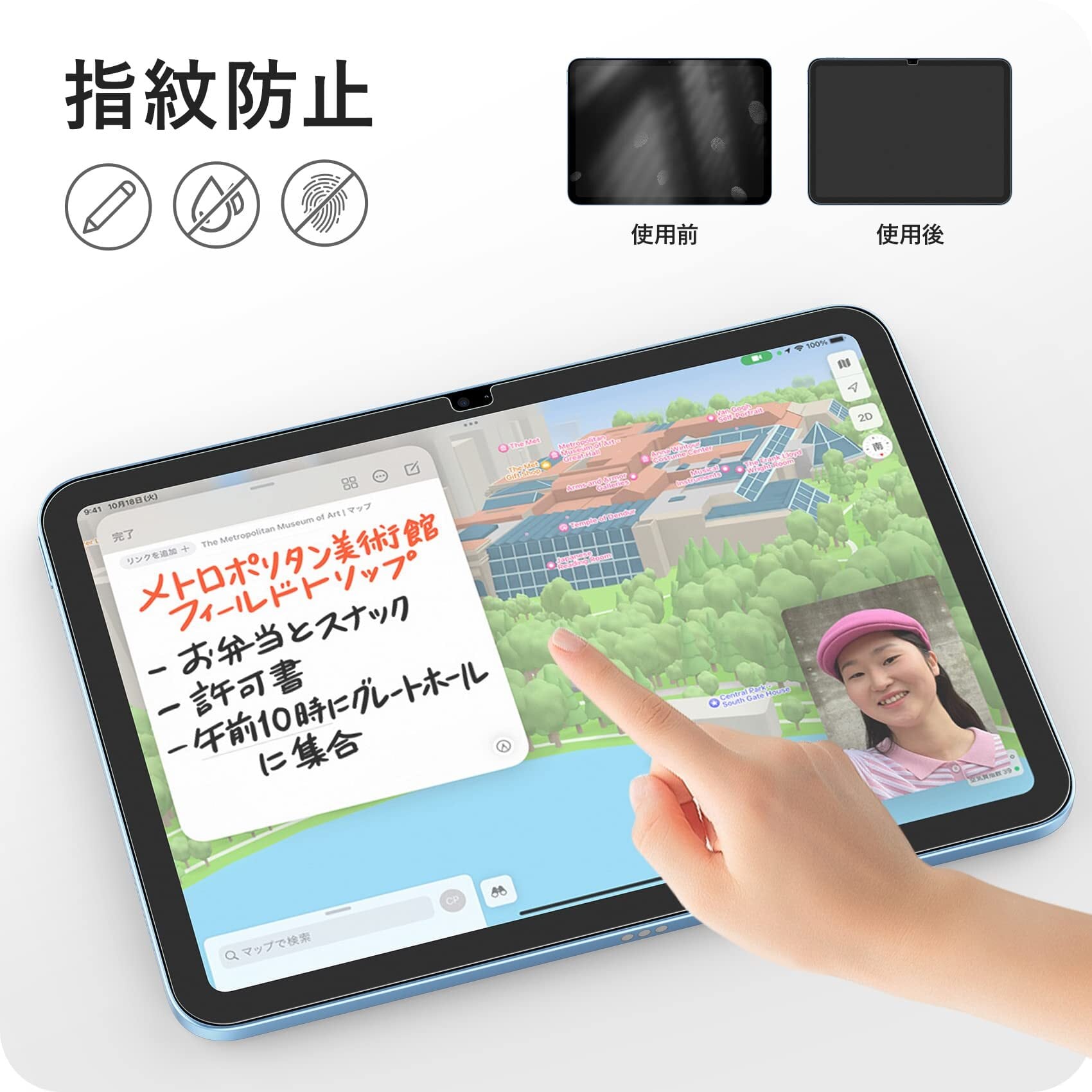 さらさらな手触り :アンチグレア加工及び撥油コーティングにより、指触りがサラサラで、画面の操作をストレスなく、快適にご利用いただけます。また、撥油コーティングを施しており、指紋がつきにくく、付着しても簡単に拭き取れます。