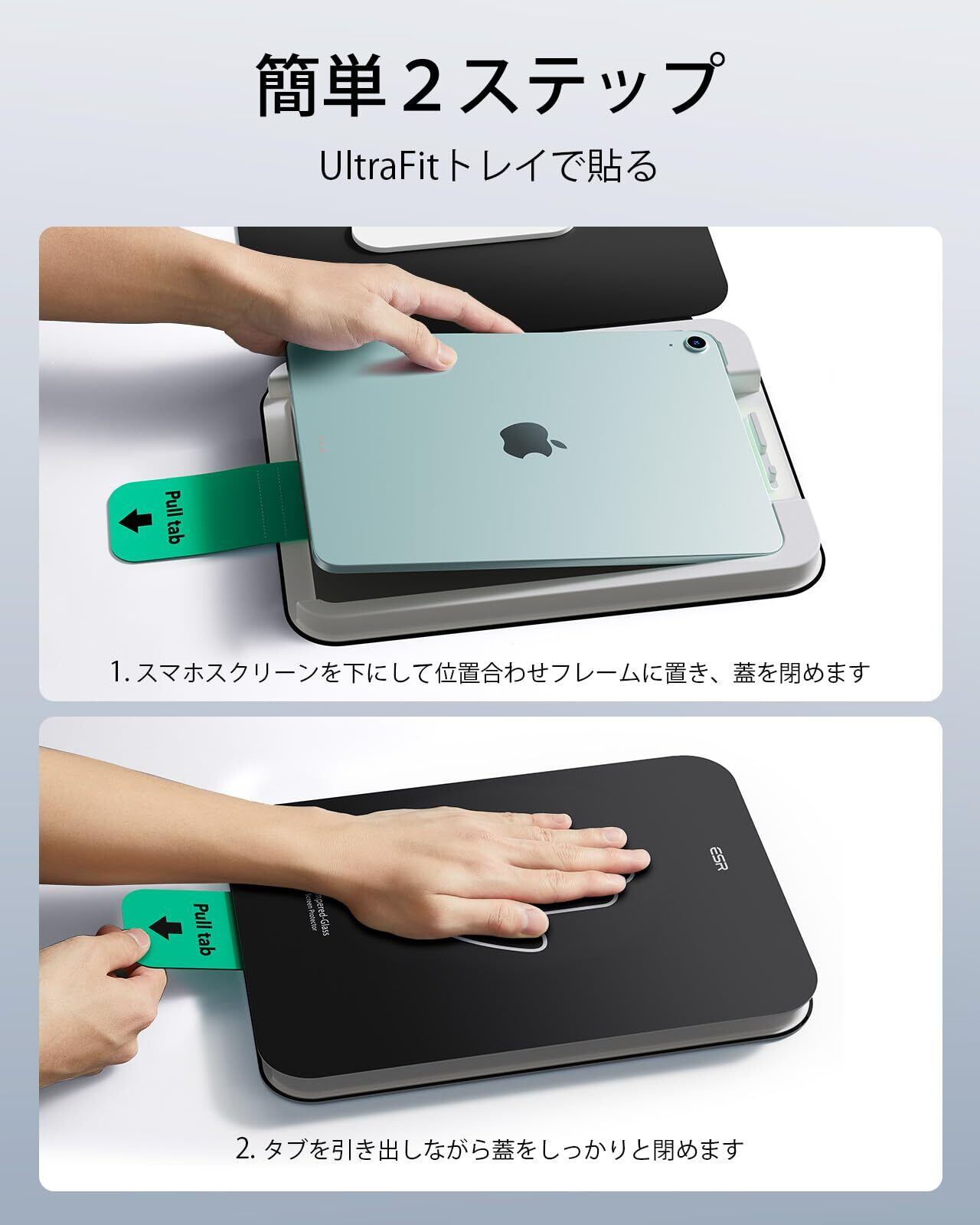 【気泡のない貼り付け】:付属しているUltraFitトレイを使用することで、正確な位置決め・ホコリ自動除去で簡単操作で気泡混入しない保護フィルムの貼り付けが行えます。