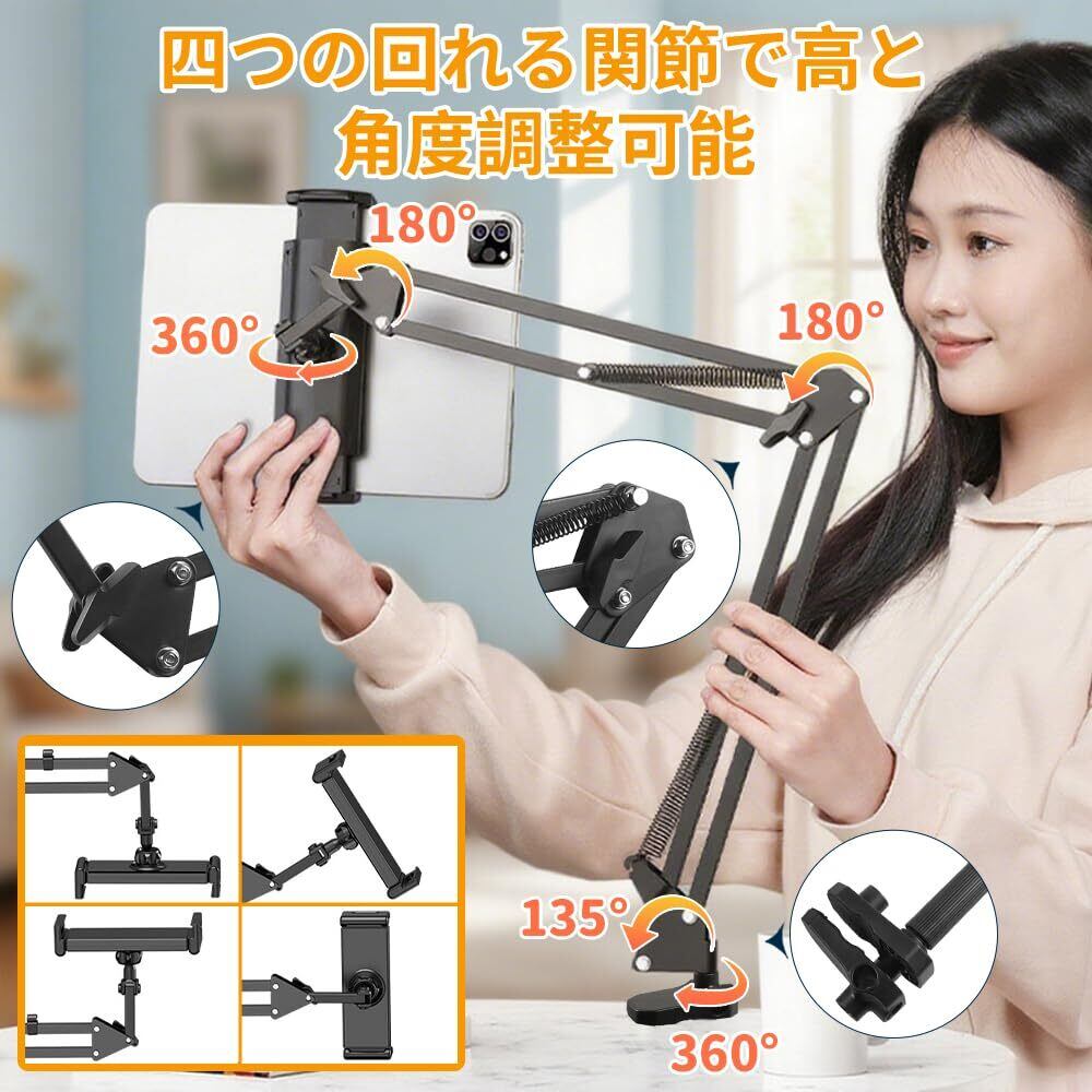 【四つの回れる関節で角度と高さ調整可能】可動域はとても自由自在!4つの可動軸と360°回転するホルダーにより、高さや角度を細かく調節できて、思った位置に簡単に調節でき、最適な視聴角度と快適さを提供できます。動画視聴やWeb会議、オンライン授業など、さまざまなシーンで利用できる便利な iPad スタンド です。お自宅にベッドに横になって快適に動画を見せることなどに最適です。