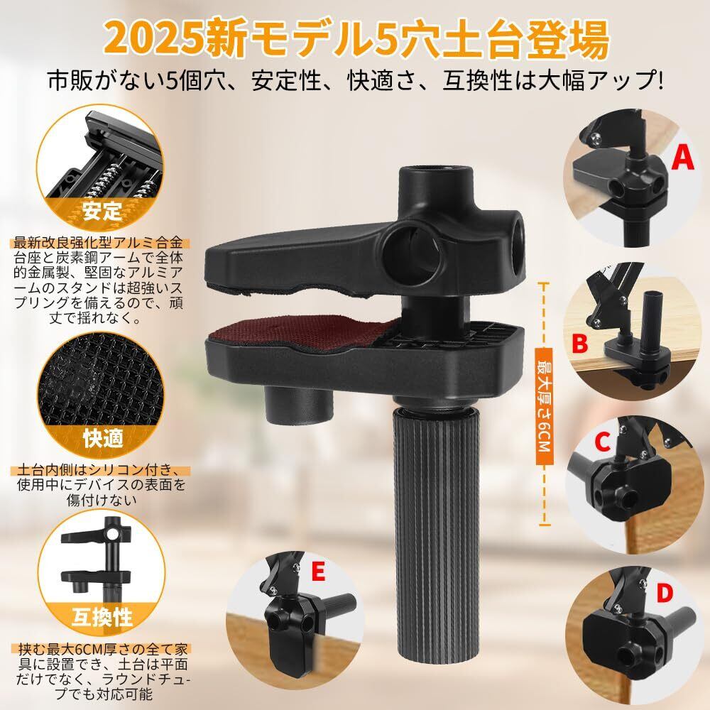 タブレットスタンド【2025最新型5穴土台&ケーブル固定具付き】寝ながら スマホスタンド 4つの関節 折り畳み式 自由角度調整 卓上スタンド 360°回転ホルダー 縦横両対応 4-12.9インチの iPad/iPhone/Surface/Galaxy/mini/Kindle/Switchに対応 (黑)