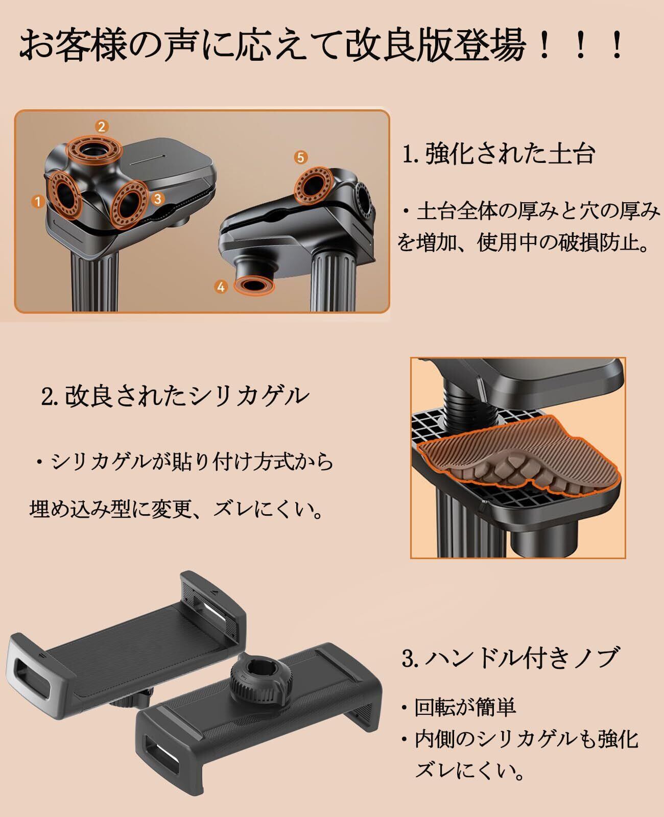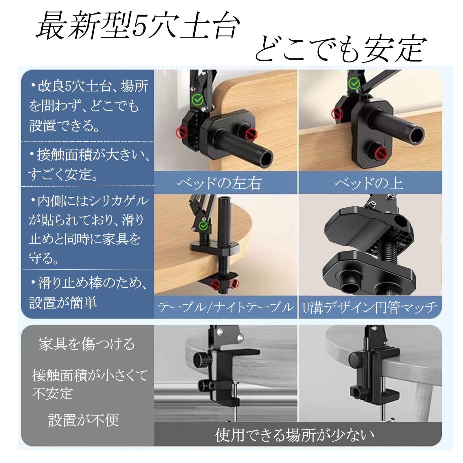 【新型5穴土台・ベッドの左右にも使用可能】から独創された新型5穴土台はベッドサイドの左、右、上とも使用可能!土台の実用性、安定性、快適さを注力します。机、ベッド、ガラスなどの1-7cm厚さの設置面は勿論、溝があるからポールなど丸い設置面にも対応しますので、家中どこでも設置できます。また、土台内側はシリコン付属、超滑り止めも加工され、土台が一度固定するとアームの角度を調整する際に勝手に外れることやタブレットを装着してからアーム末端が垂れ下がることは徹底的に改善しました。土台とアームの接続部にはシリコンが2環あり、一度取り付けると揺れない。