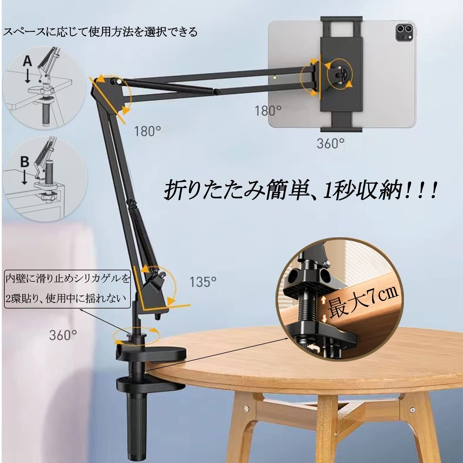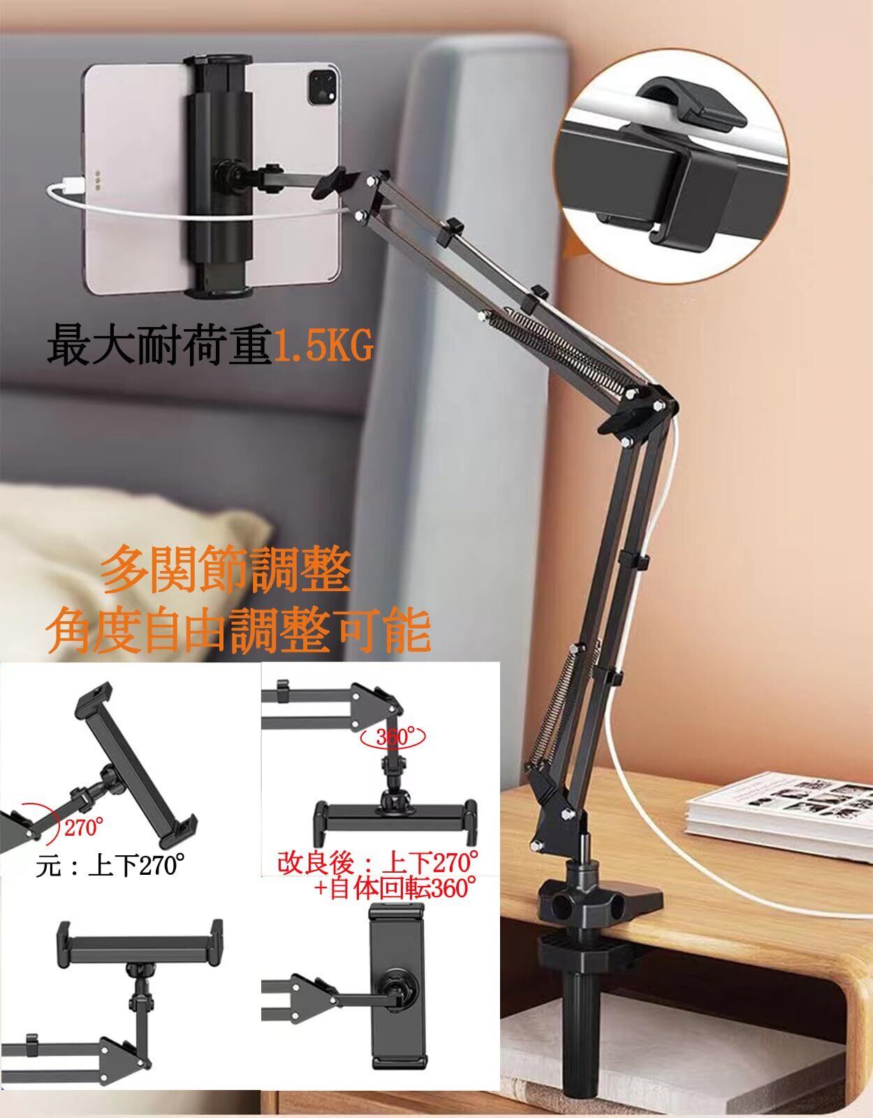 【安定性強化・耐荷重強い・ケーブル固定具付属】タブレット スタンド上質な碳素钢素材と強力なスプリングにより、安定性頑丈さを実現しました。スマホ アームは超精密加工炭素鋼の材質且つ関節部分も金属補強加工のため、重さが大きいタブレットやモニター(1.5kgまで)でも負担できます。付属したケーブル固定具はアームに取り付けるだけ、ケーブルが邪魔にならずに充電しながらタブレットやスマホをご覧になれます。