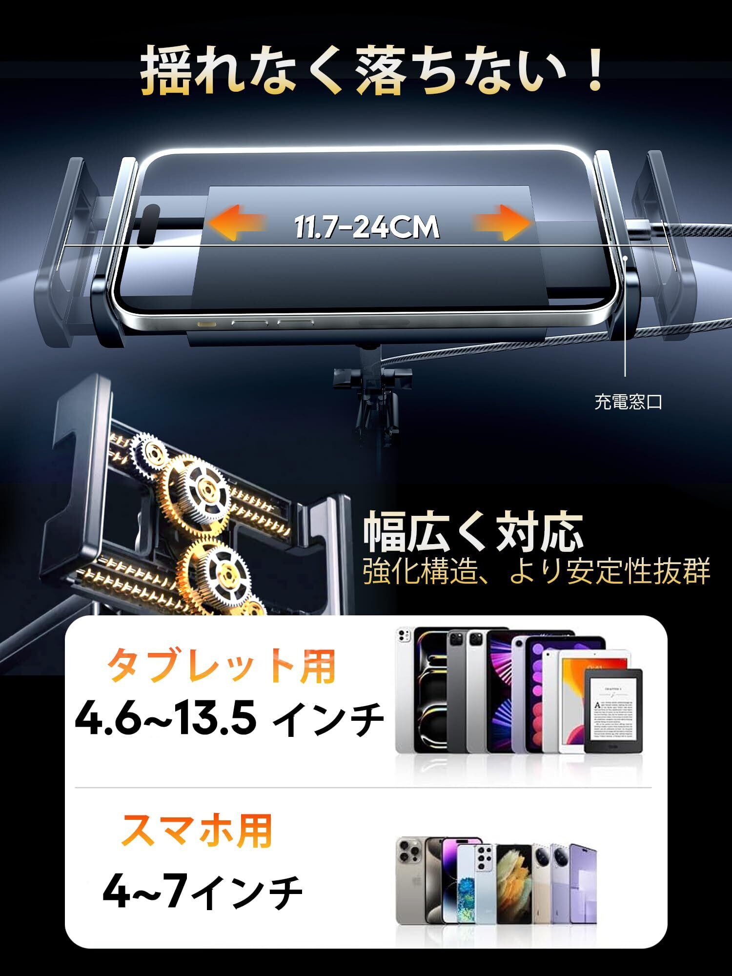 【約4~13.5インチ for iPad、タブレット、Kindleと携帯電話に適用】デバイスの対応サイズは約4~13.5インチ(117mm~240mm)なので、スマホから大型のタブレットまで、幅広いサイズの端末で利用できます。 4~13.5インチfor Kindle,N-Switch,Android Surface,Fire HD 10、Fire HD 8,iPad 第11/10/9/8/7世代、iPad Air 第7/6/5/4/3世代、iPad Pro 第7/6/5/4/3/2/1世代(2018年~2024年モデル)、iPad mini 第7/6/5/4/3/2/1世代,IPhone 16シリーズ/15シリーズ/14シリーズ/13シリーズ/12シリーズ/11シリーズ/Xシリーズ/SEシリーズ/8シリーズ,Samsung Galaxy S25/ S24/ S23/ S22シリーズ,Google Pixelシリーズ/Nexusシリーズ,Huawei,Xiaomiなどの機種を対応できます。