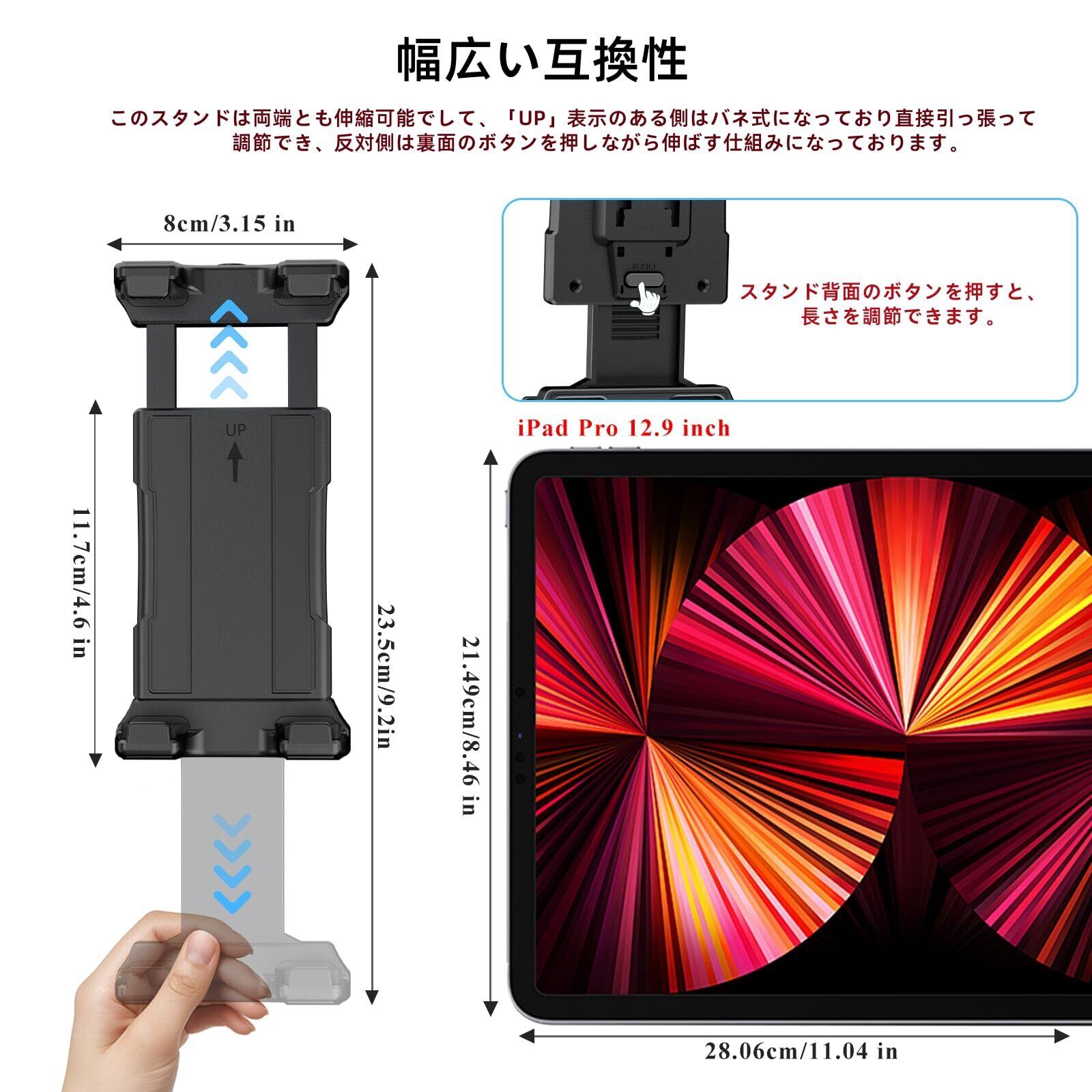 【タブレット&スマホ対応】このタブレットスタンドは7〜13インチのタブレットだけでなく、5〜7インチのスマートフォンにも対応しています。(iPgalaxy tabホルダーの両端は伸縮可能で、「UP」と表示された側は背面のボタンを押すことで伸ばすことができます。滑り止めパッド付きの4つの爪で、大切なデバイスをしっかりと固定し、傷からも守ります。