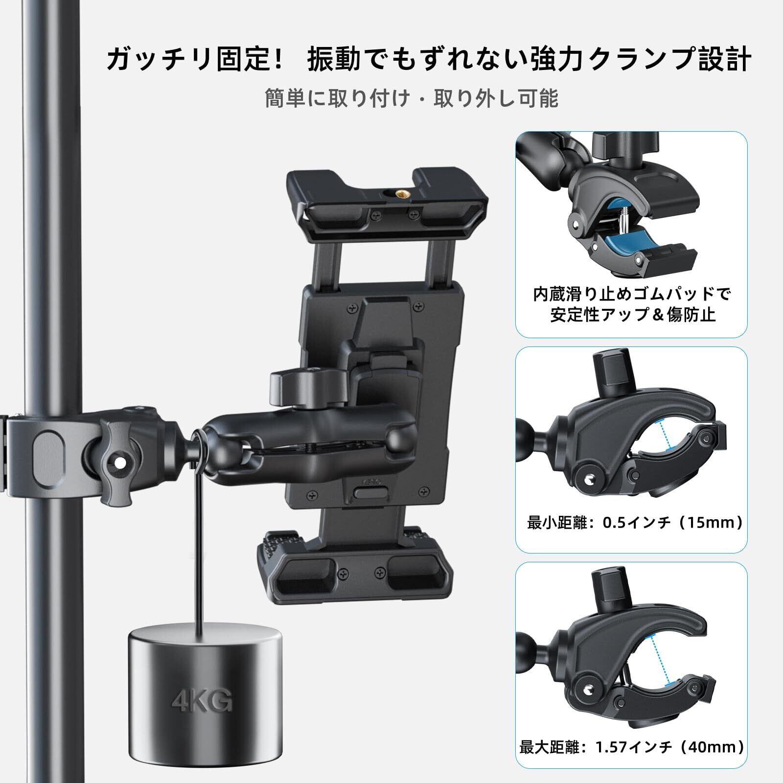 【多機能タブレットスタンド】OHLPRO iPadスタンドのクランプ対応直径は0.7インチ〜2.35インチ(約1.8〜6cm)で、自転車・バイク・マイクスタンド・フィットネスバイク・ランニングマシン・デスク・三脚・ベビーカー・トラック・浴室など、様々なシーンに対応可能です。クランプの内側には滑り止めラバーパッドが内蔵されており、バーを傷つけずに摩擦力を高め、しっかりと固定されるため、デバイスの揺れや落下を防ぎます。