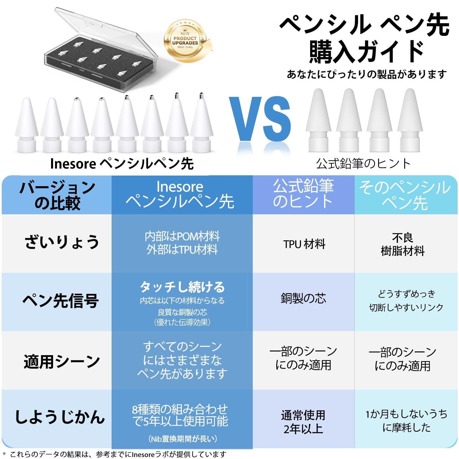 Inesore 8個入り【プロ推薦】 アップルペンシル ペン先 収納ケース付き、Apple pencil 第1/2世代/USB-C/Pro ipadペンシル ペン先 対応 apple pencil 替え芯 高感度チップ 予備8個セット (純正オリジナル芯2個、金属芯6個:短芯2個、細芯2個、長芯2個)
