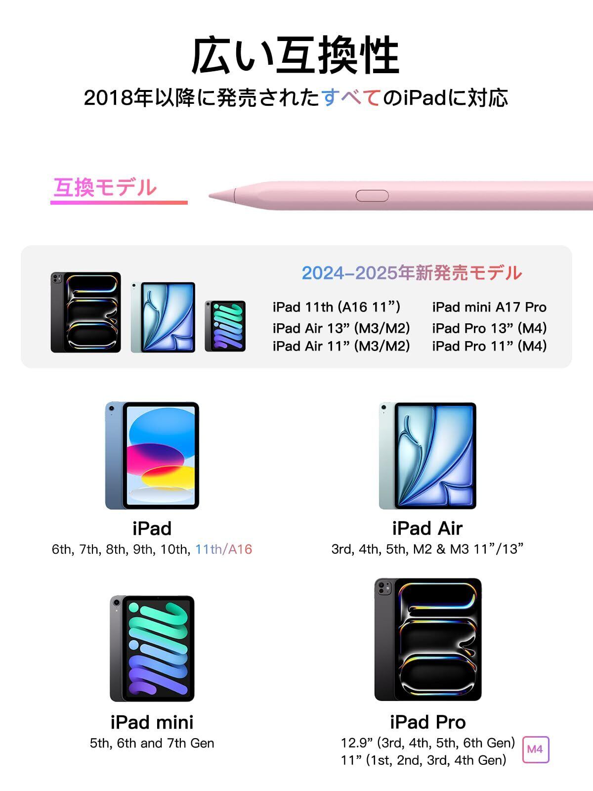 【ワンクリック取り消し・極上体験】アップルペンシル 2018年以降iPad対応 Type-C急速充電 タッチペン iPad ペンシル 傾き感知/パームリジェクション/超高感度/磁気吸着/スタイラスペン 替え芯3枚付き iPad 11/10/9/8/7/6、iPad Pro m4 13"/12,9''/11''インチ、iPad Air M2/5/4/3、iPad Mini 7/6/5に対応 ピンク