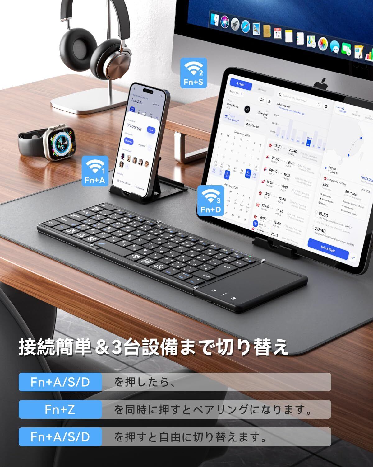 【最新型】Omikamo キーボード bluetooth 折り畳み式 ワイヤレス JIS標準日本語配列 ipad キーボード スマホ マルチペアリング タッチパッド付き iOS/Windows/Android/Mac/Google対応 無線 コンパクト 軽量 薄型 ipad mini パンタグラフ 充電式 (黒)