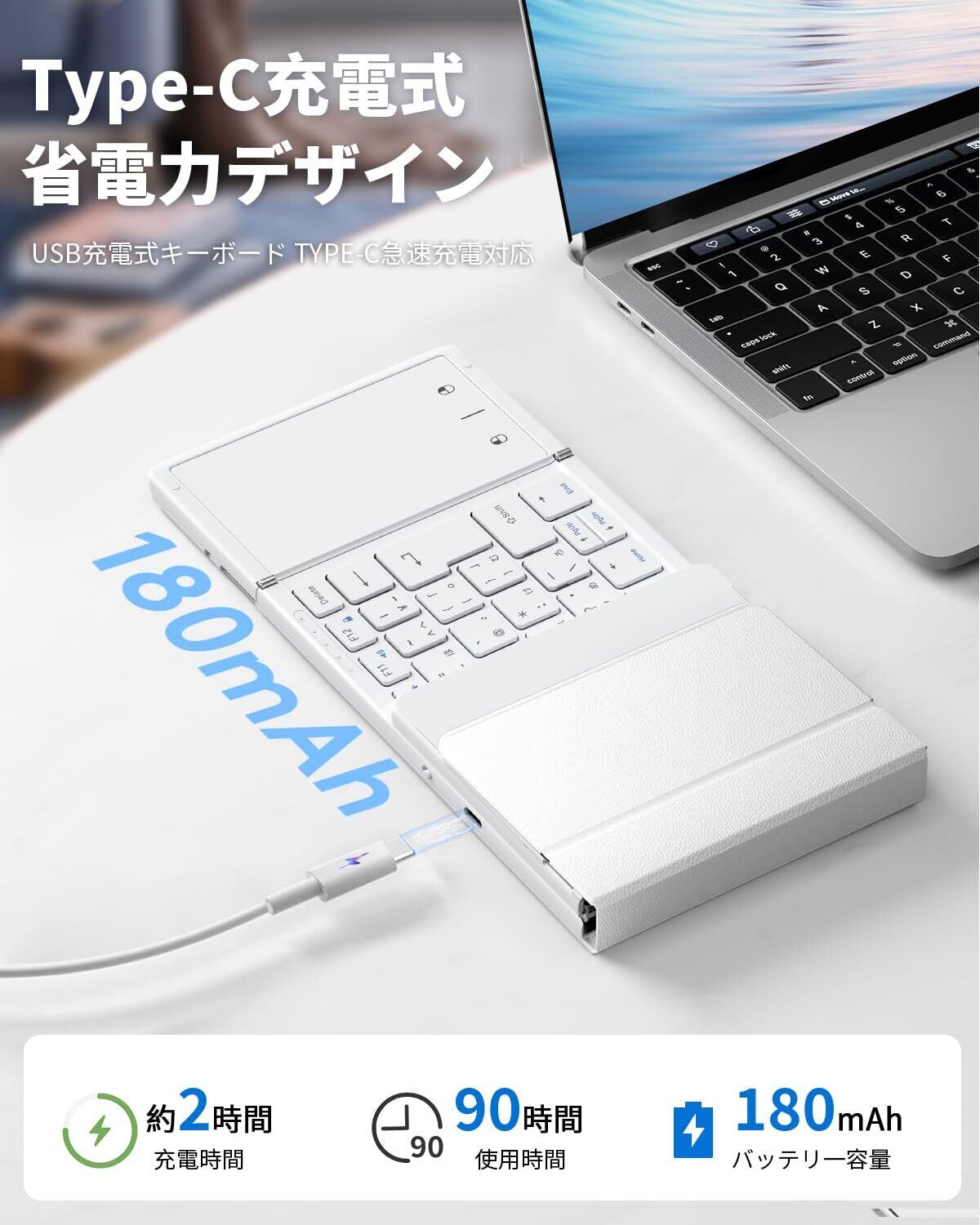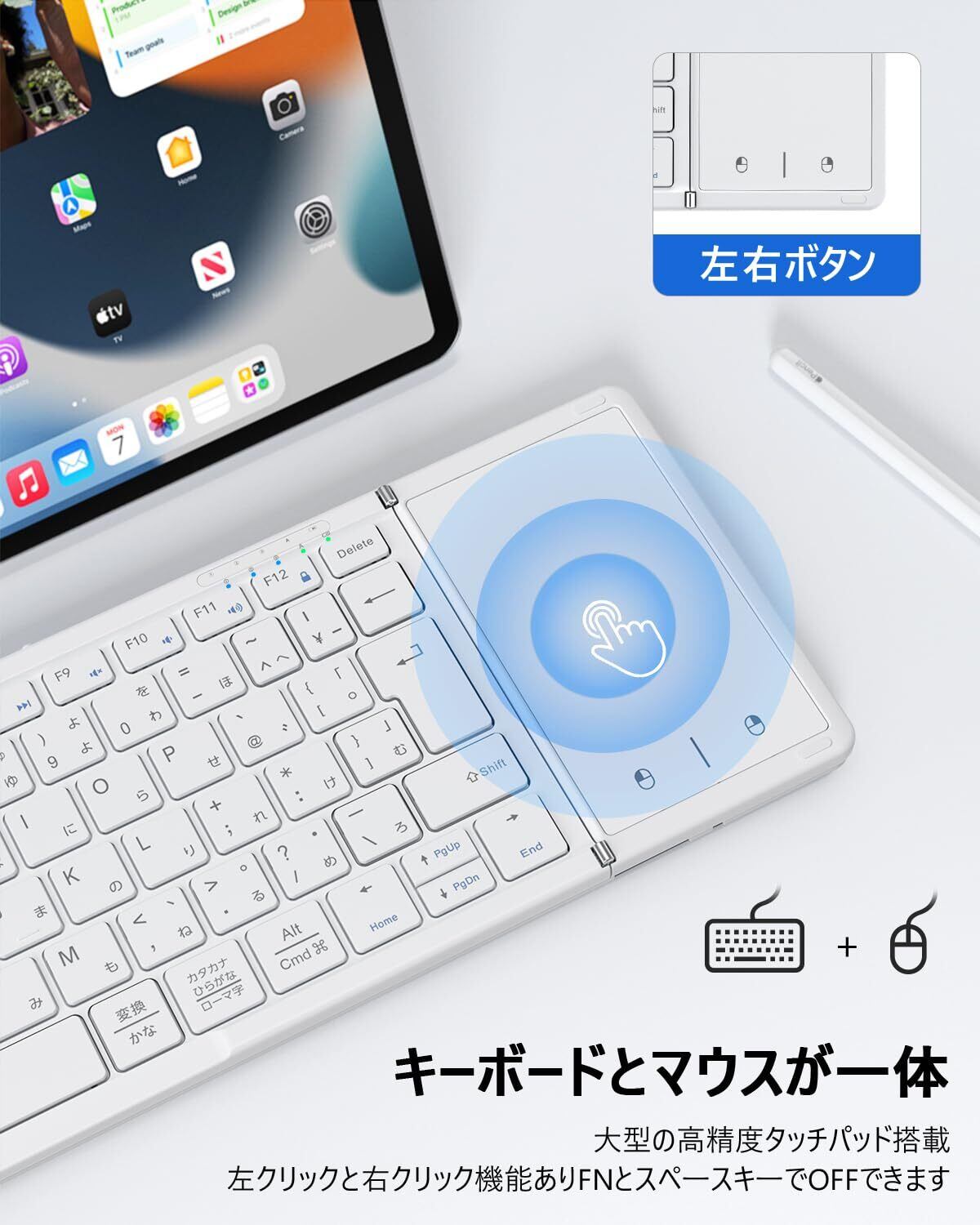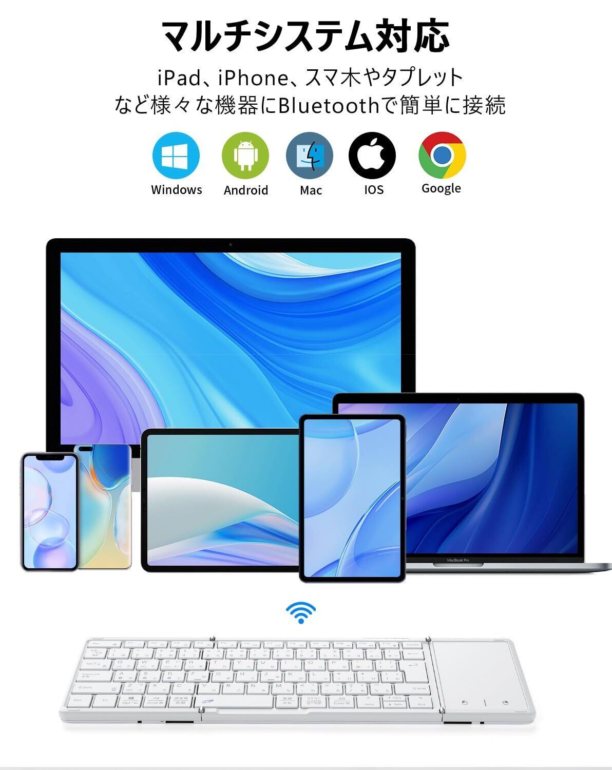 【最新型】Omikamo キーボード bluetooth 折り畳み式 ワイヤレス JIS標準日本語配列 ipad キーボード スマホ マルチペアリング タッチパッド付き iOS/Windows/Android/Mac/Google対応 無線 コンパクト 軽量 薄型 ipad mini パンタグラフ 充電式(白)