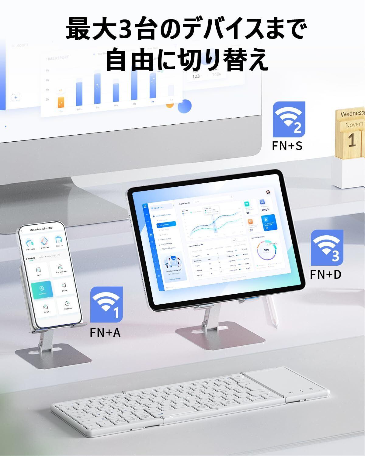 【接続簡単&コンパクトな無線 キーボード】パンタグラフ キーボードのBluetooth接続も簡単で使いやすく、入力遅延もありません。折り畳めるため非常にコンパクトで持ち運びに便利です。使わない時は畳んで置いておけるので、邪魔になりませんし、キーボードが埃をかぶることもありません。