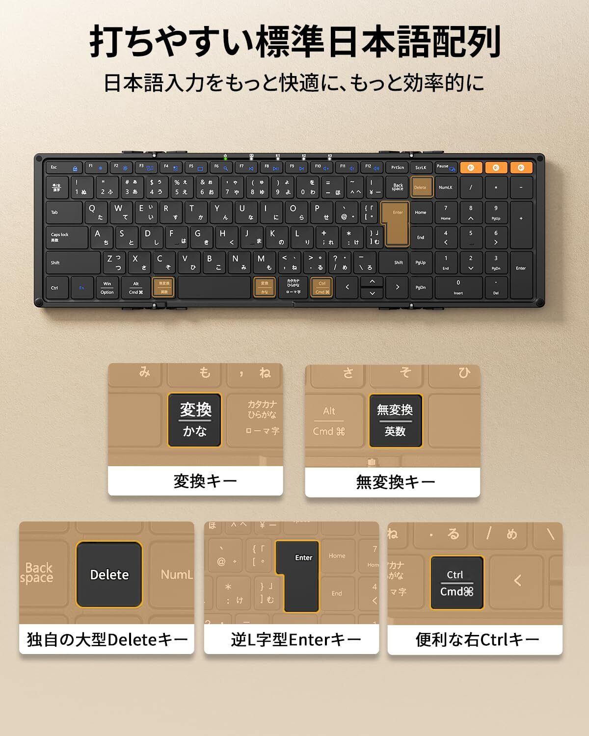 【打ちやすい標準日本語配列】JIS規格に準拠した標準日本語配列を採用しており、普段使いのキーボードから違和感なく移行できます。この折り畳みキーボードには、逆L字大型Enterキーや「半角/全角」キー、「変換」「無変換」キーなどの日本語入力に特化したキーだけでなく、右Ctrlキーや独立した大型Deleteキーなどの作業効率を高める特殊キーも配置されているため、スムーズな文字入力が可能です。