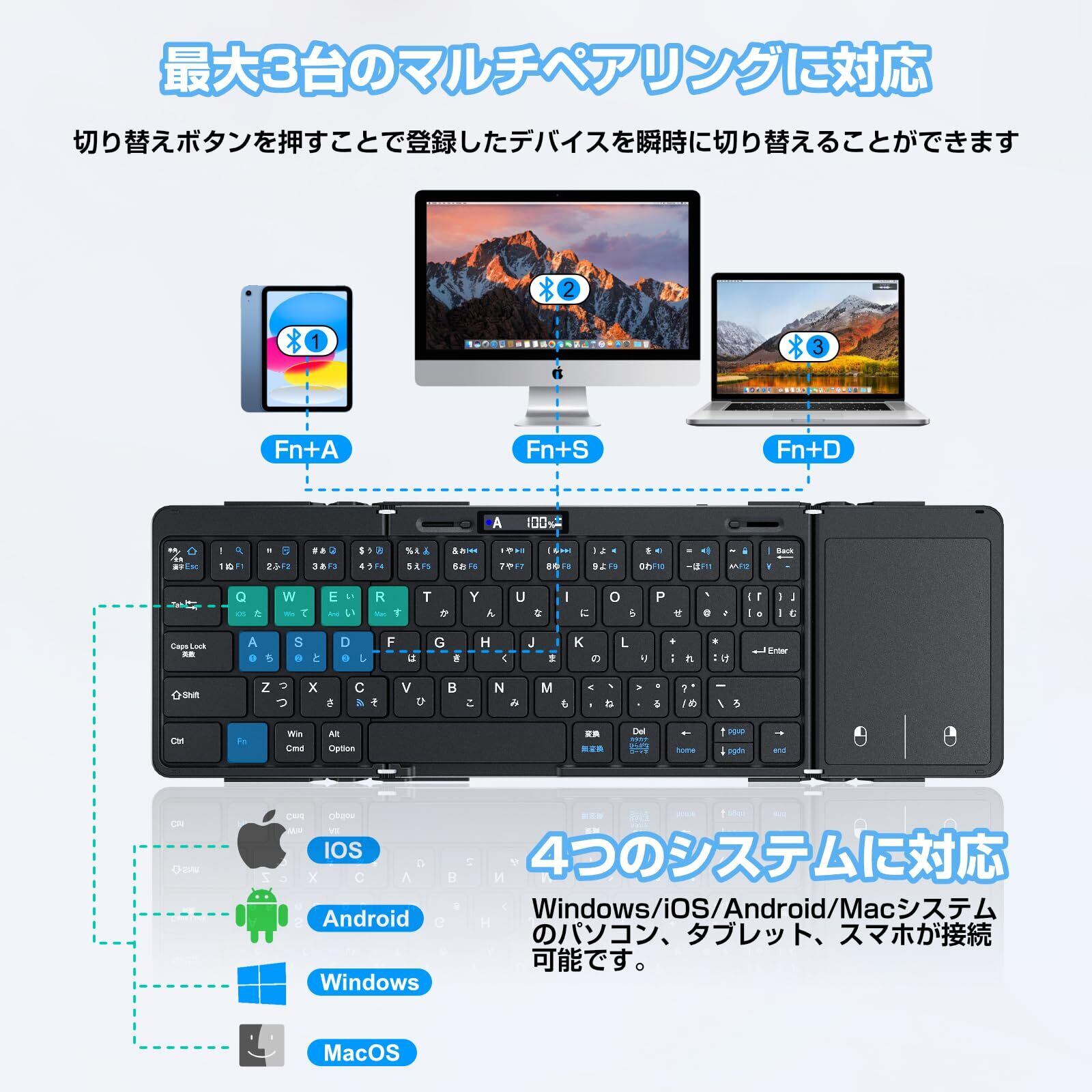 Ewin キーボード bluetooth 折り畳み ワイヤレス 日本語配列 3台デバイス切替接続可能 ipad/iphone iOS/Windows/Android/Mac/Googleなど対応 タッチパッド付き LED電量残量表示 フルキーボード 無線 薄型 持ち運び コンパクト アルミ合金 JIS配列 USB-C充電式 ケース付属