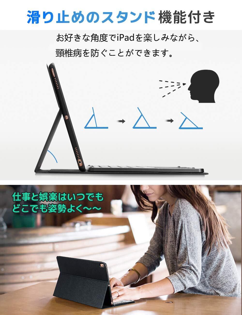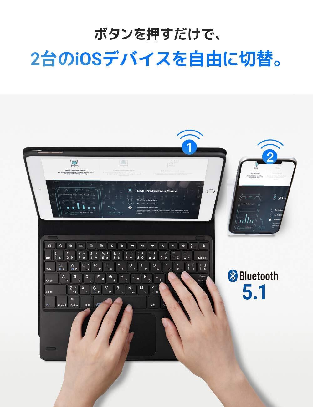 【脱着式キーボード付き】 ※ご注意:キーボードの数字キーの位置に対して、商品のアップグレードをしました。※bluetoothキーボードは分離式で、単独で使用することが可能です。2台のiOSデバイスとペアリング可能で、ボタンを押すだけで切り替えることができます。ipad 10.2 ケースのキーボードはJIS日本語配列レイアウトを採用し、音量調整やメディアプレーヤーの操作などのマルチメディアキーを搭載しています。搭載のタッチパッドは必要ない時、ロックされることができます。