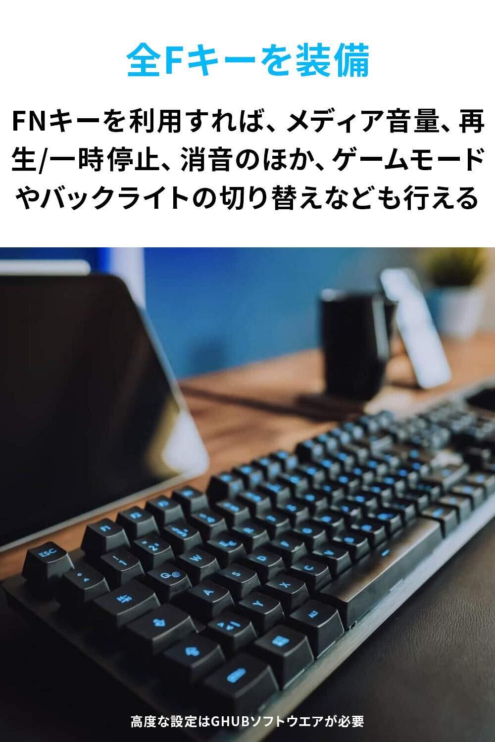 ・【全Fキーを装備】メディアとライトを指先で制御。FNキーを利用すれば、メディアの音量、再生/一時停止、消音のほか、ゲームモードやバックライトの切り替えなども行えます。Logicool G HUBのFNキー切り替え機能を使用すると、デフォルトでこれらの代替コマンドを実行するようにファンクションキーを設定できます。