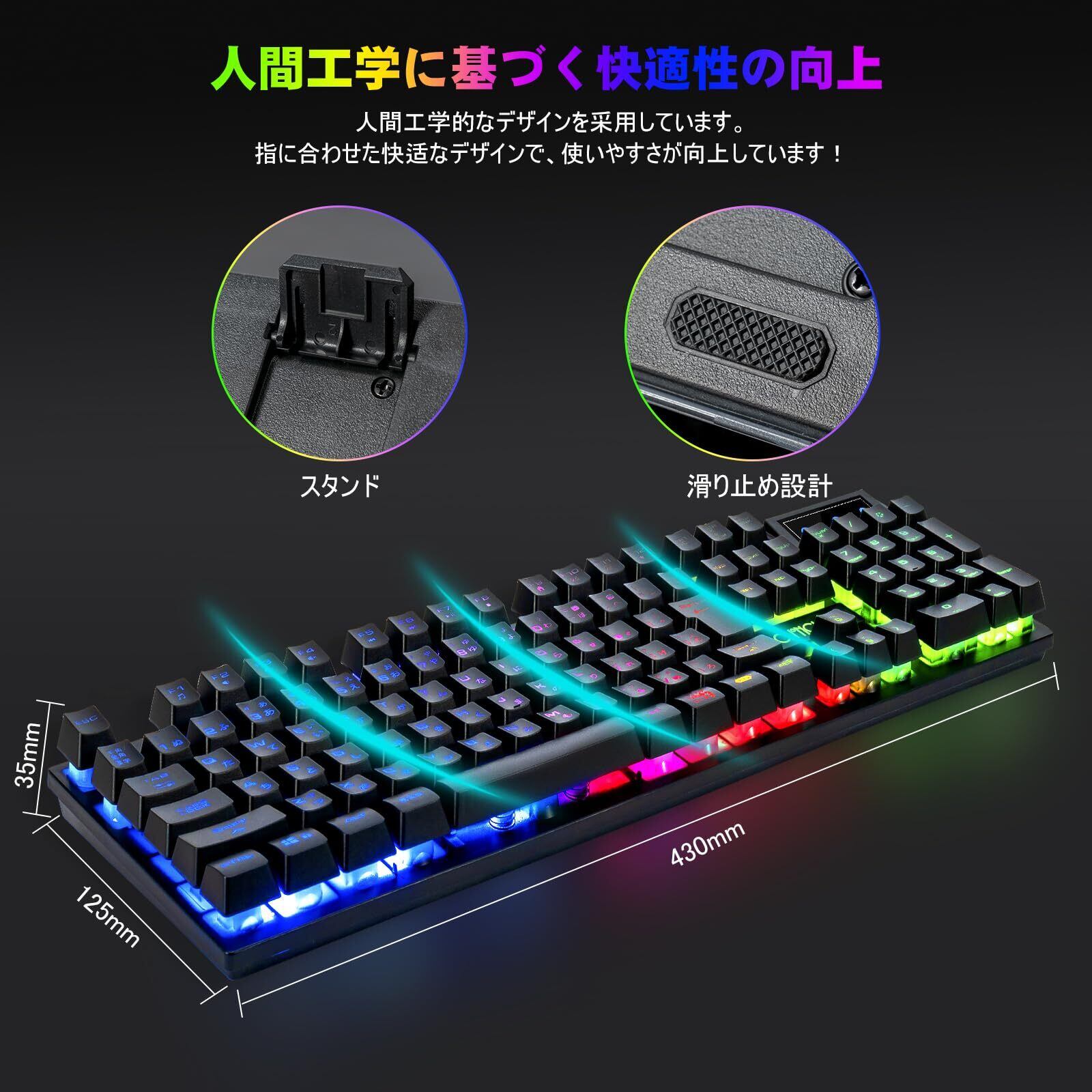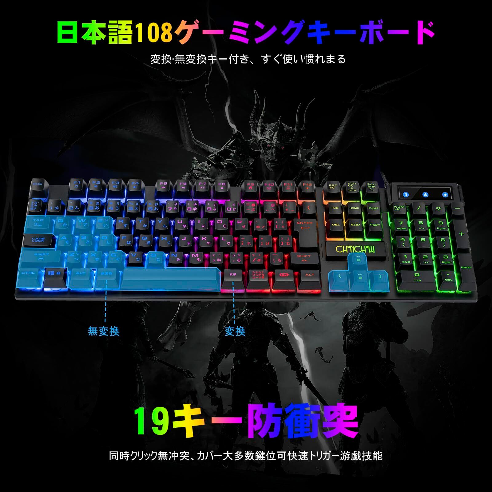 CHONCHOW ゲーミングキーボードマウスセット スイッチ ps4/ps5対応 日本語配列 7色ゲーミングマウス「無変換」/「変換」キー付き テンキーレス 光る 有線 4段階DPI 19キー防衝突 108キー PC/Windows/Mac OS対応 ゲーミングキーボードマウスセット 401J