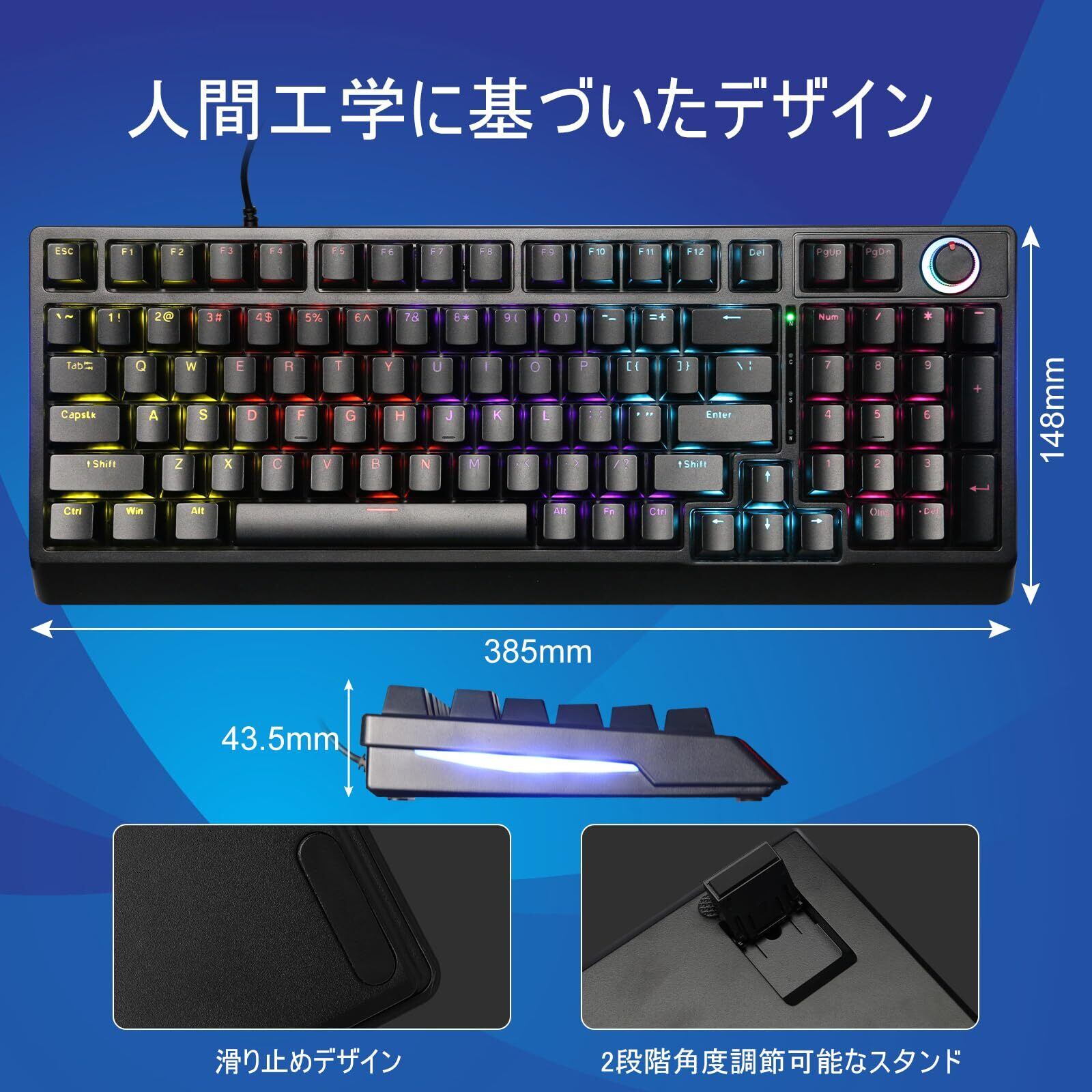 【超省スペースレイアウト】メカニカルキーボードには98個のキーがあり、必要な文字、数字、ファンクションキーを保持しながらキーボードスペースを最大限に活用します。レイアウトにはノブボタンが配置されており、左右に回して音量を調整したり、押し下げてミュートしたりできるため、ユーザーはさまざまなシナリオで簡単にタスクを実行できます。