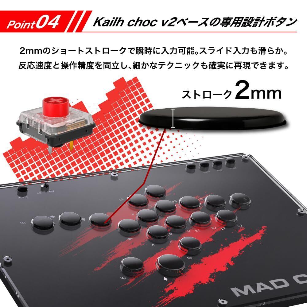 ■ Kailh Choc V2ベースの専用設計ボタン 2mmのショートストロークにより、瞬時の入力が可能。スライド入力も滑らかで、精密な操作やコンボ入力を求めるプレイヤーに最適です。 反応速度と操作の一体感を高次元で実現。