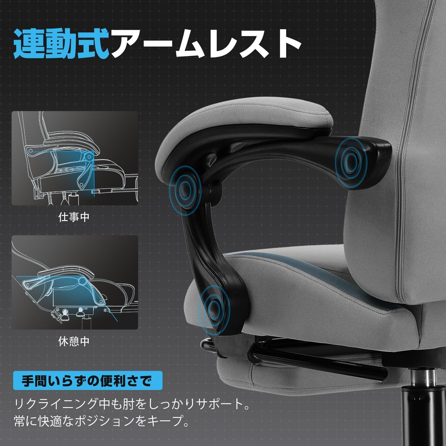 【インフルエンサーが愛用するゲーミングチェア】若い世代のニーズに応えるため、私たちは市場調査を重ね、コンパクトで洗練されたデザインのゲーミングチェアを開発しました。`「通気性あるのファブリック」×「キルティングデザイン」×「135°リクライニング」×「連動式アームレスト」×「オットマン付き」×「異臭なし」など、様々な機能を備えています。高級感あふれるデザインに、快適さをプラス。