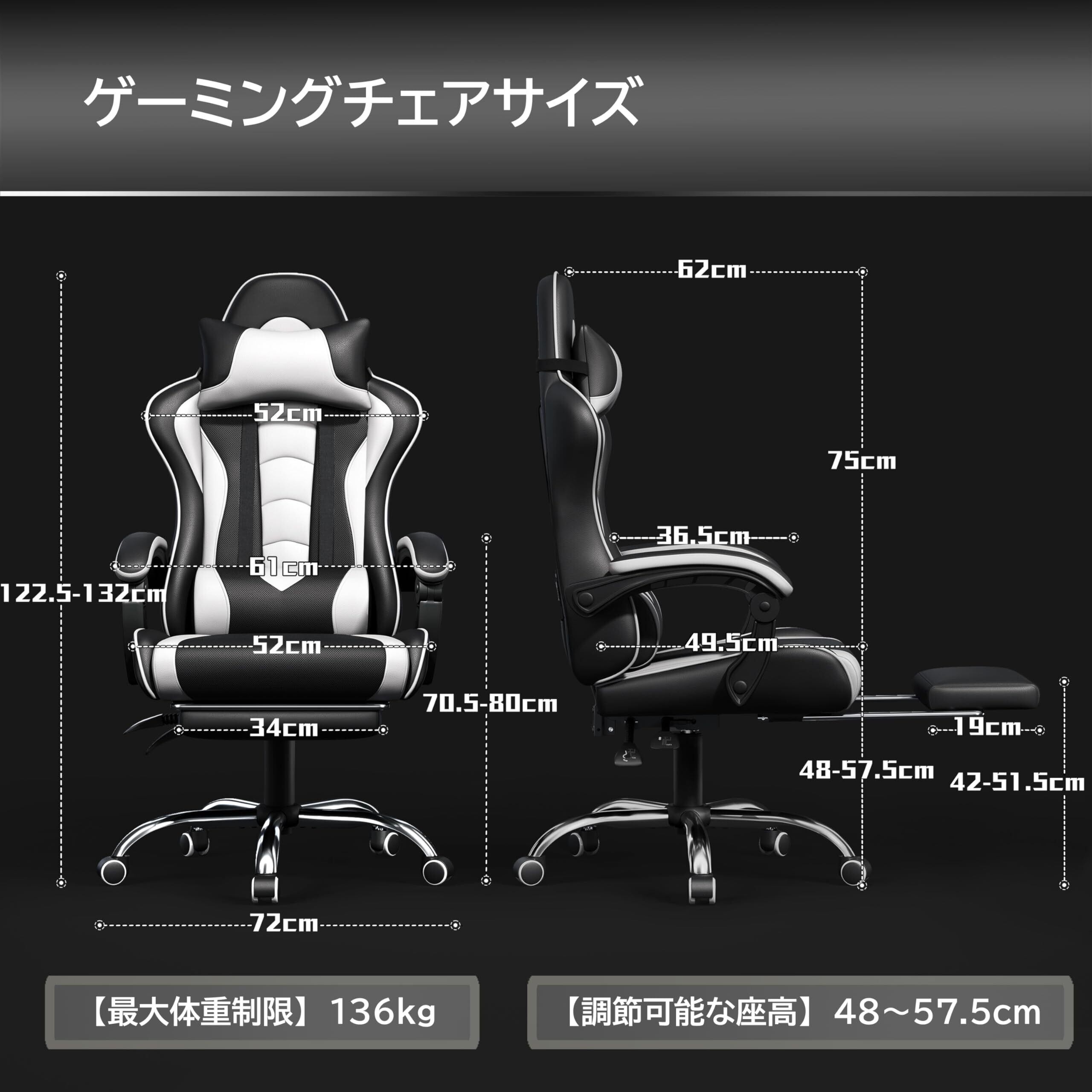 【座面の高さ調整可能】座面の高さは48cmから57.5cmまで簡単に調整でき、身長やデスクの高さに合わせてぴったりのポジションに設定可能です。ゲーマーだけでなくオフィスチェアとしてもおすすめ。最大耐荷重は136kgで、安心してお使いいただけます。
