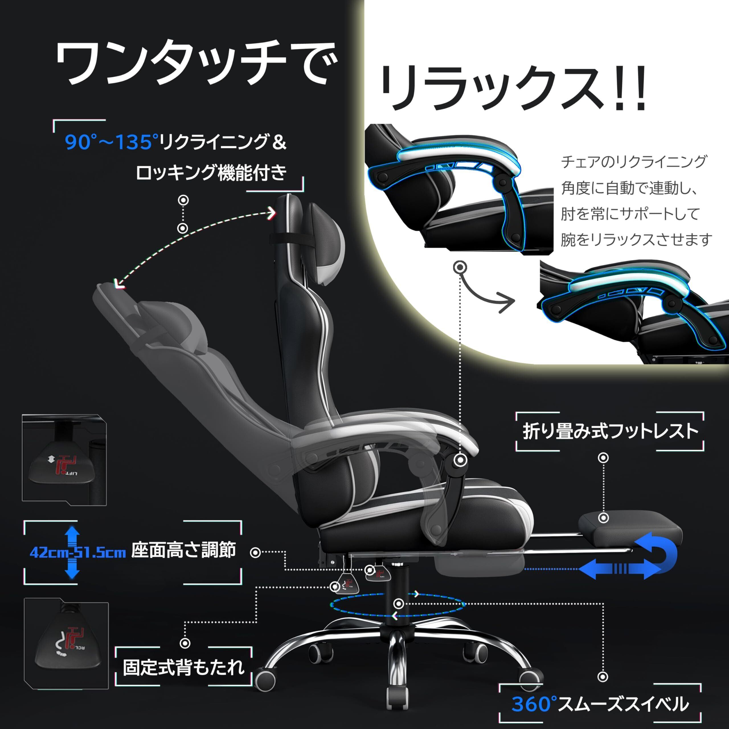 【多機能設計】座面の高さは48cmから57.5cmまで簡単に調整可能。USB給電式の振動機能が心地よいリラックス感をもたらし、日本人の体型に合わせた約10cm厚の座面が快適な座り心地を実現します。90~135度のリクライニング、背もたれ連動のひじ掛け、収納式フットレスト、9.5cmの昇降機能、360°回転など多彩な機能を搭載。作業やゲーム、休憩時に椅子・ソファ・リクライニングチェアとして自由に使え、あぐらもかける広々設計の多機能チェアです。
