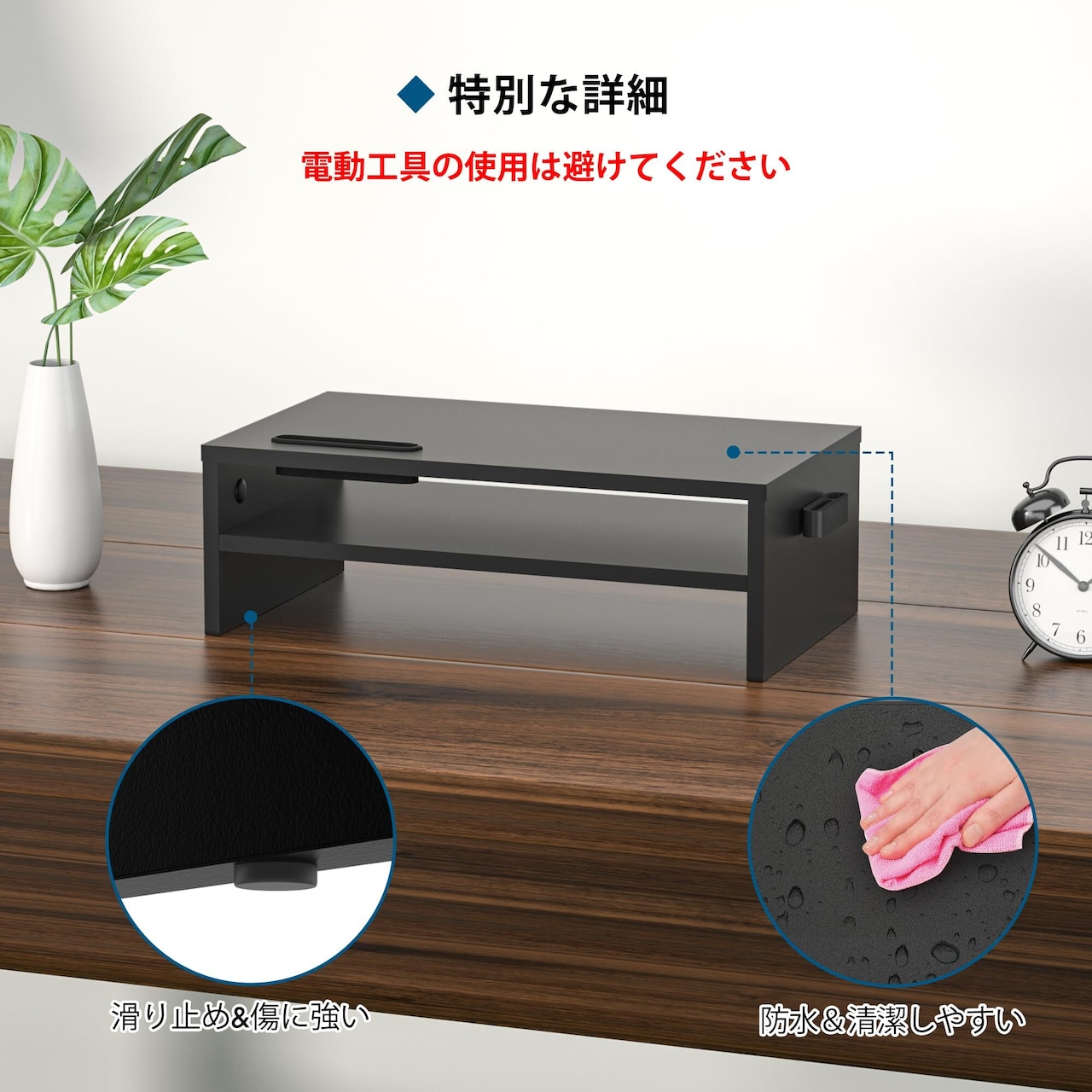 【高品質&フラットデザイン】このモニタースタンドは環境にやさしく高品質のマットMDF素材(天板厚さ12mm)で作られています。精巧に磨かれた滑らかな表面、平らなエッジ、無臭の特性を備えたこの木製ディスプレイスタンドは変形しにくく、モニターやMacbook、ノートパソコン台に対応します。天板はフラットタイプで、凹凸がないのでホコリもたまらずお手入れ簡単です