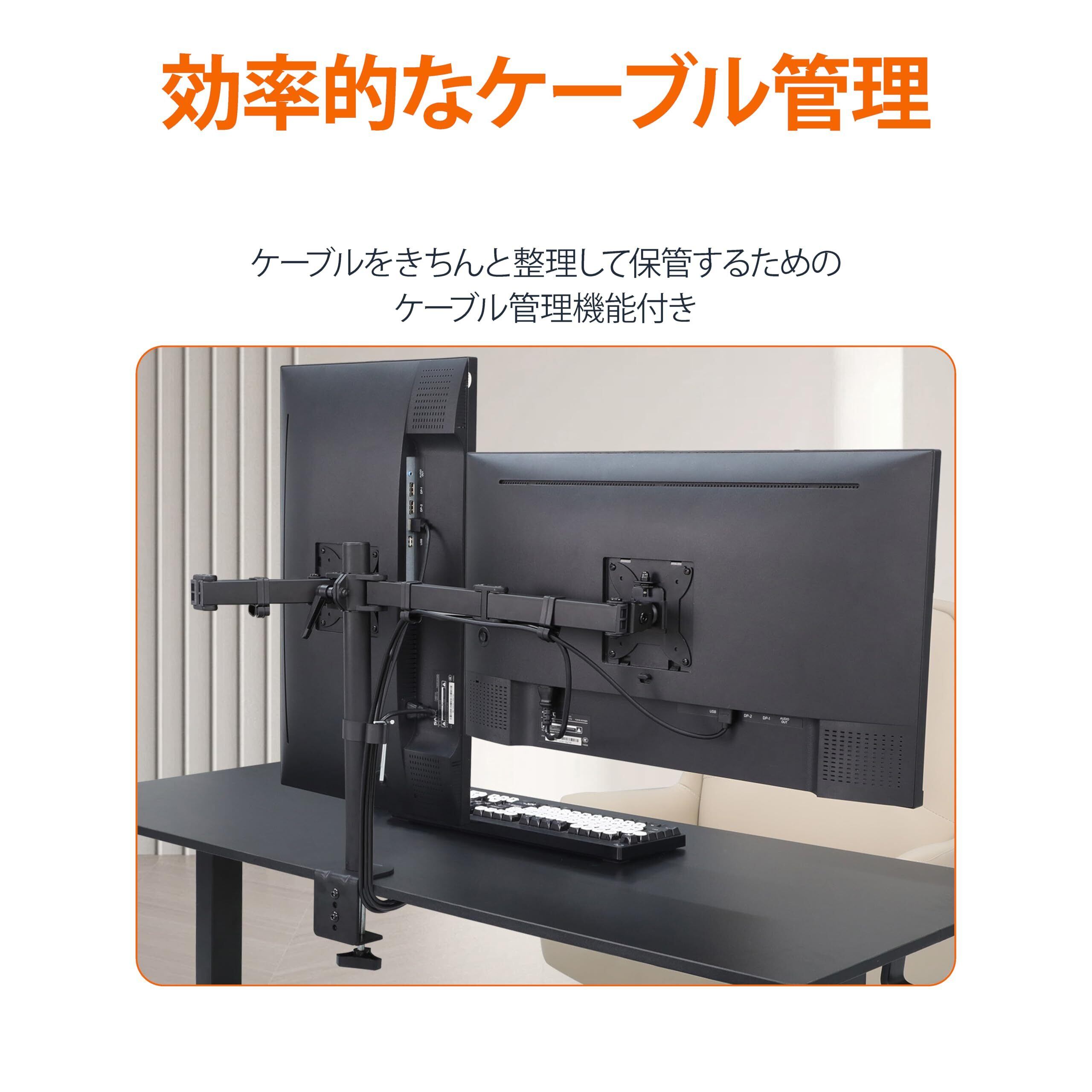 対応モニター: 最大32インチまでの2つのLCD LEDモニターに対応。モニターアームを使うことでデスク周りをすっきり整頓できます。