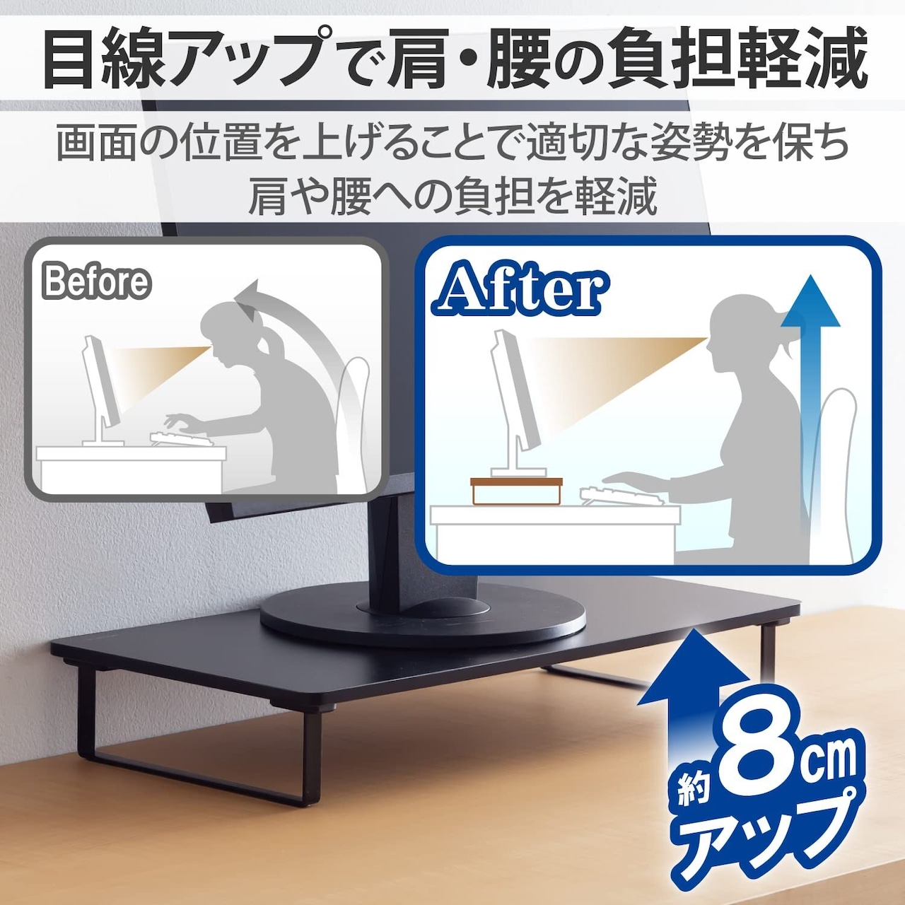 ■8cmの台でディスプレイ使用時の目線を上げられるため、パソコン作業の際の姿勢を改善することができます。