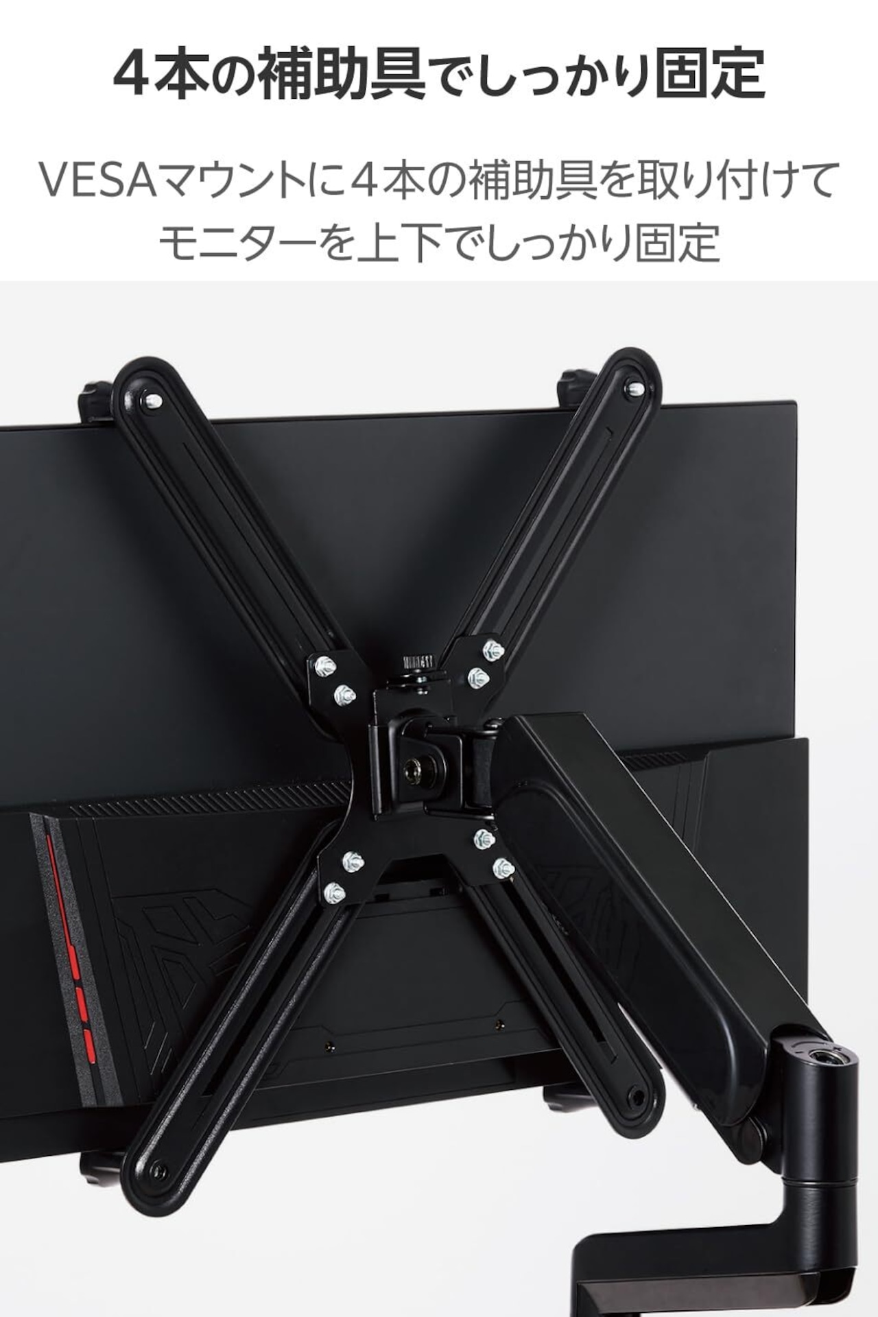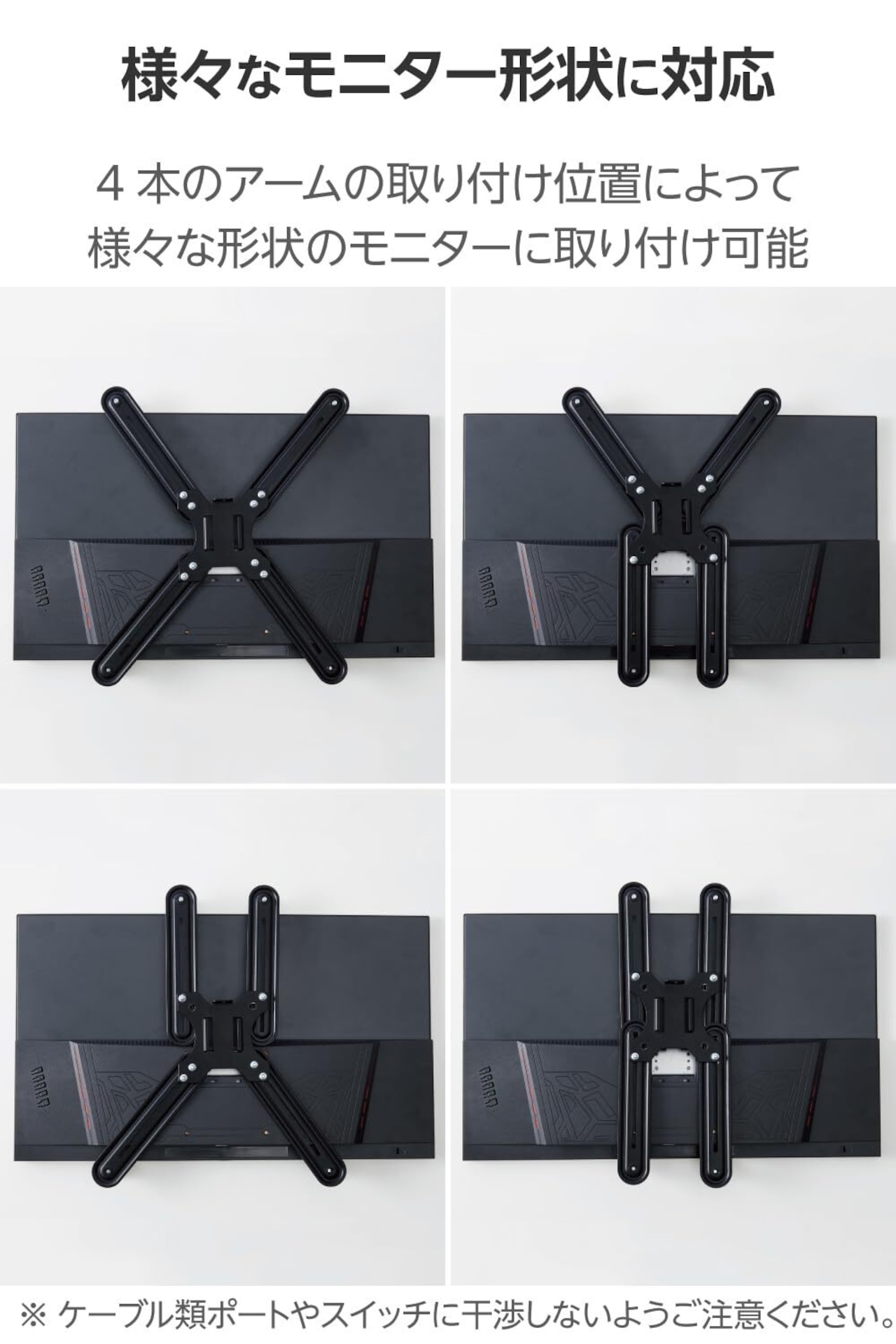 4つのアームシステムで、さまざまな形状のモニターに合わせて調節し、固定します。26.5~60mmの厚さのほとんどのモニターをサポートします。