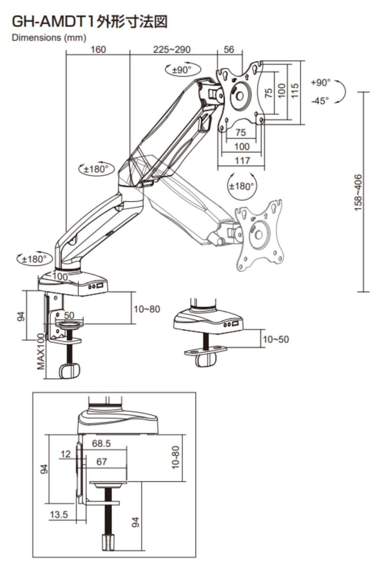グリーンハウス モニターアーム 17-32インチ対応 耐荷重2-9kg 3年 メカニカル 4軸 GH-AMDT1-BK