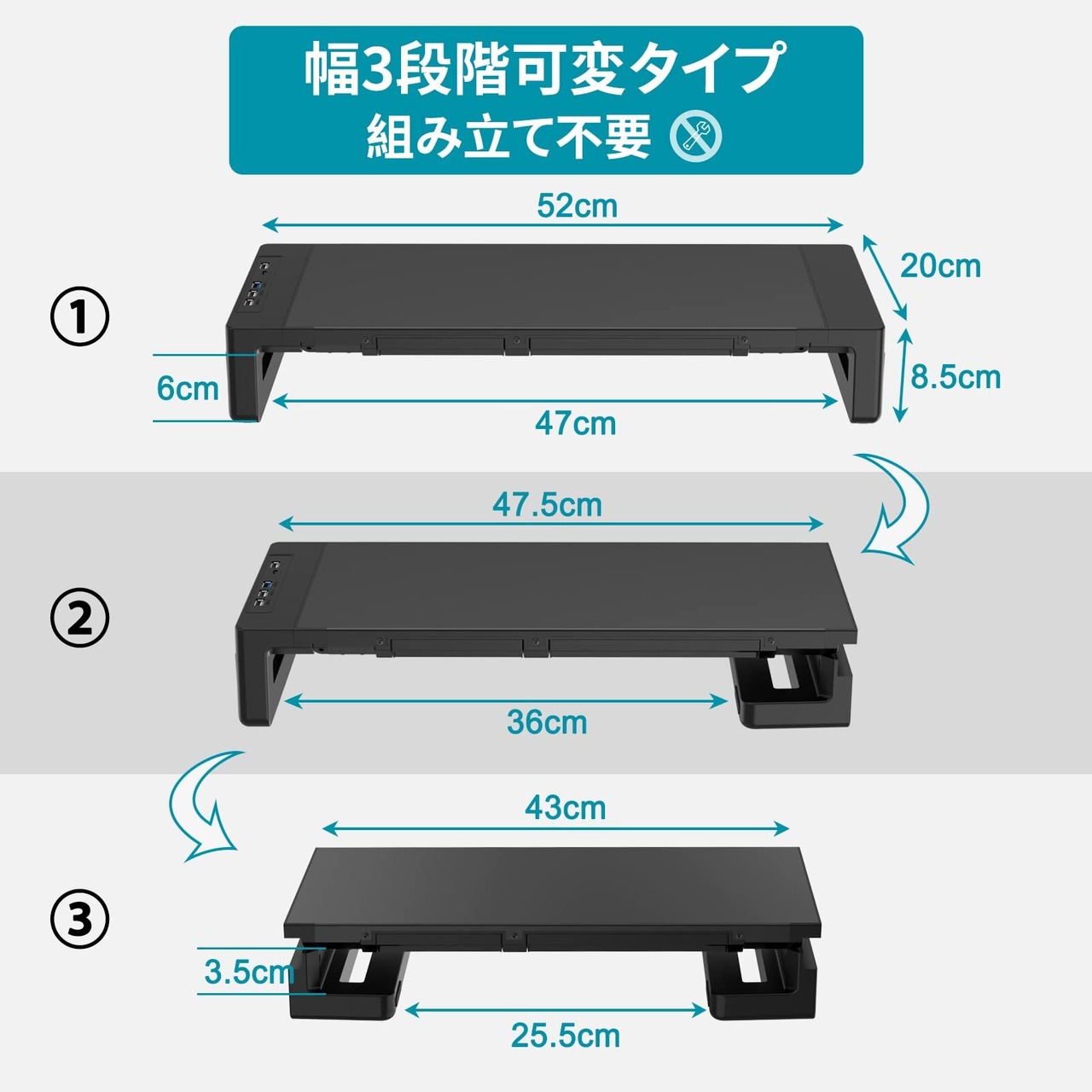三つの幅調整可能のPCスタンド:42.5cm、47cm、52cmの3つの幅で調整可能です。 幅を自由に折りたたむことができ、パソコンのモニターを8.5cmまで上げることにより、科学的な視覚高さは背中を曲げることを避けられ、首や背中の疲れを効果的に和らげることができます。