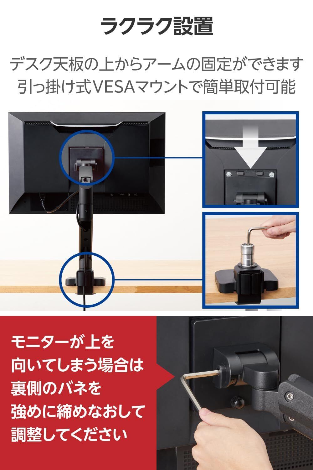 ■モニター背面にVESAマウントを取り付け、モニターアームのフックにひっかけるだけで設置できます。